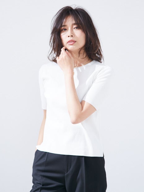 着回し力の高いベーシックなニットTシャツ。さらっと1枚で、ジャケットのインに、オンオフ問わず幅広く合わせていただけます。白でも透けにくく1枚で着ていただけて、ご自宅で手洗いしていただけるので、ヘビローテーション間違いなしの1枚。