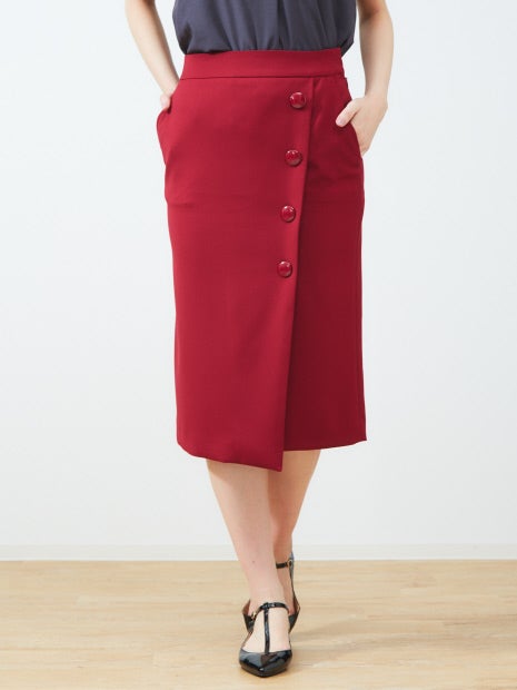 ストレッチが効いたダブルクロス素材を使用したタイトスカート。ハイウエストなので、すっきりとしてスタイルを良く見せてくれる効果も。ラップ風のデザインとレトロな雰囲気のボタンをアクセントにしています。内側にスリットが隠れているので、タイトスカートなのに足さばきも抜群です。トップスをインして着こなすのがおすすめ。