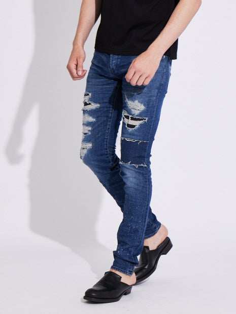【テキスタイル】伸縮性と耐久性に優れた定番ハイブリッドデニムにリペア加工&USED加工を加え、クラッシュ部分の当て布には本革のストレッチゴートレザーを使用。【デザイン】スーパーストレッチスキニーデニムにブランドの得意とするリメイク加工を施し、当て布にはストレッチゴートレザーを贅沢に使用。穿くだけでラグジュアリーな雰囲気を堪能できる高級スキニーデニムに仕上げました。