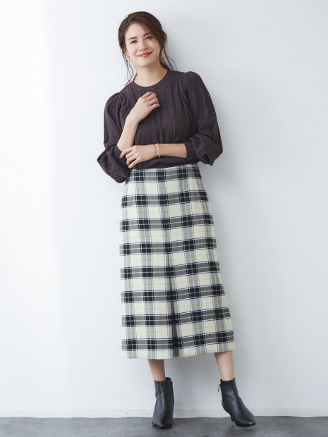 タイトスカートやテーパードパンツと合わせて甘さを調節するのが着こなしのポイント。
