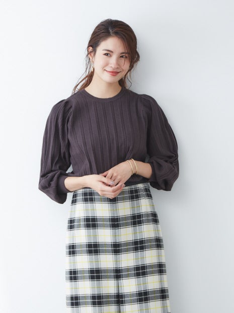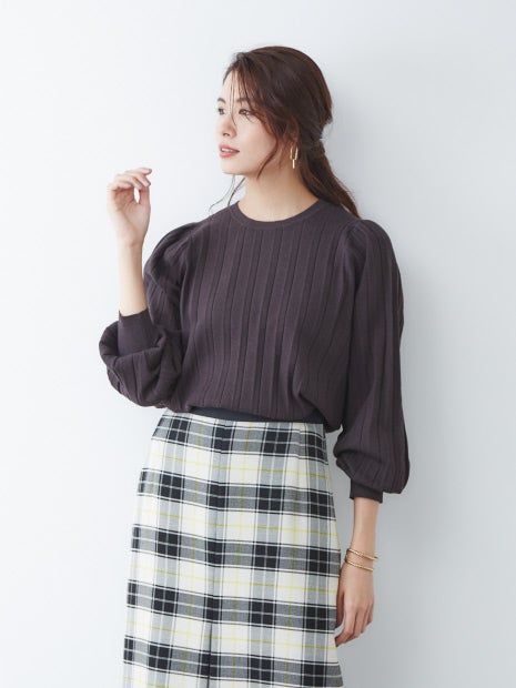 パフスリーブとタイトめなクルーネックが、メリハリのあるフォルムを作ってくれるニットプルオーバー。