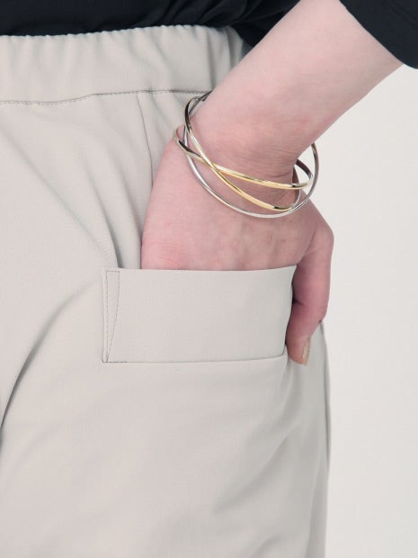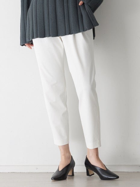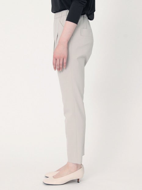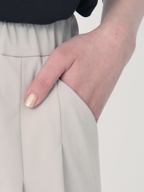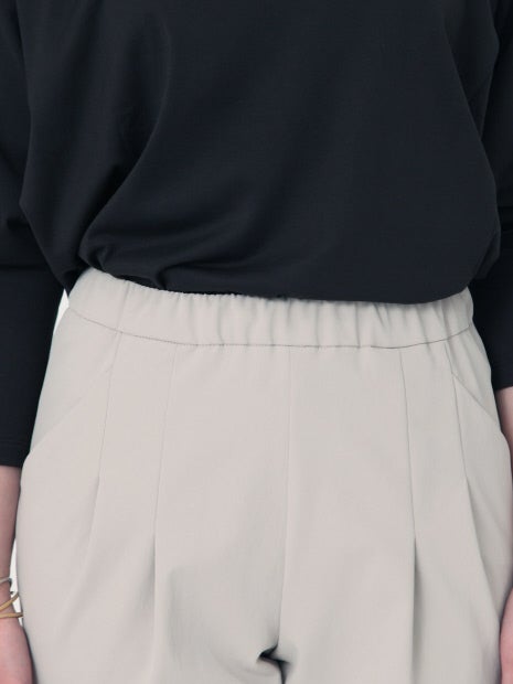 ウエスト部分のタックを短くし、ポイントを上げることでスタイルアップ効果と太もも部分のもたつきを軽減。