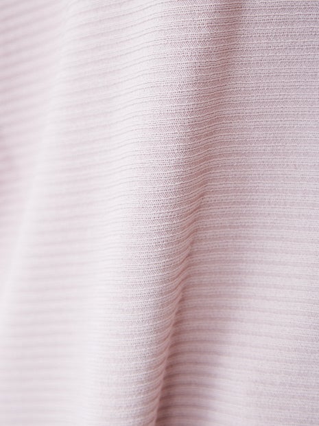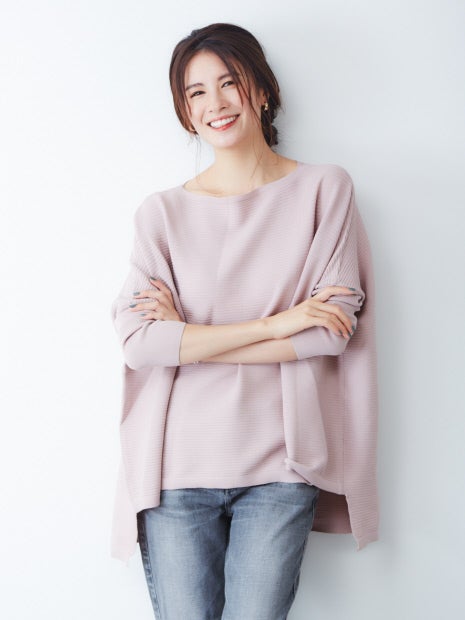 リブ編みのニットながら、横にリブをとっていて身体のラインを拾いすぎないデザインで体型を選ばず着ていただけます。