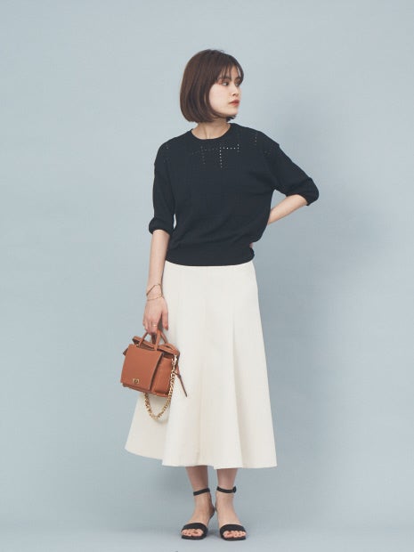 フレアスカートやテーパードパンツなど、綺麗めボトムと合わせると通勤スタイルに。