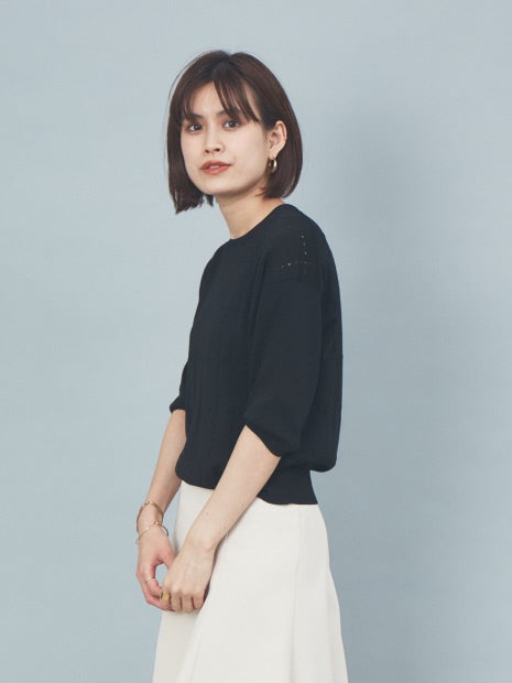 ウィンドウぺーンチェックをアイレット(編みで作る穴)で表現した表情のあるニット。