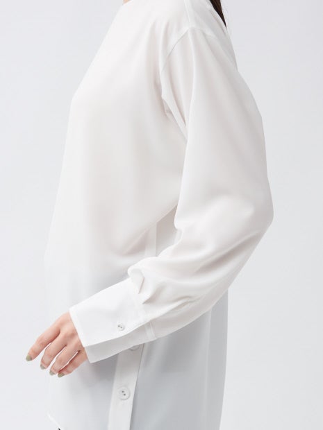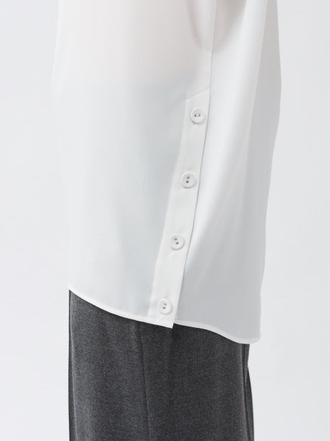 サイドボタンがアクセントをプラスし、一枚でサマ見えするブラウス。