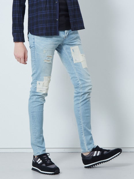 【素材】ブランド定番のハイブリッドデニムをベースにしています。キックバック性に優れており、ダメージ加工にも耐久性の高いデニムになります。【デザイン】定番スキニ―シルエットをベースにシーズンに合わせてライトインディゴにフェードしています。リネンガーゼをコンビネーションさせた春夏イメージのカスタムデニム。