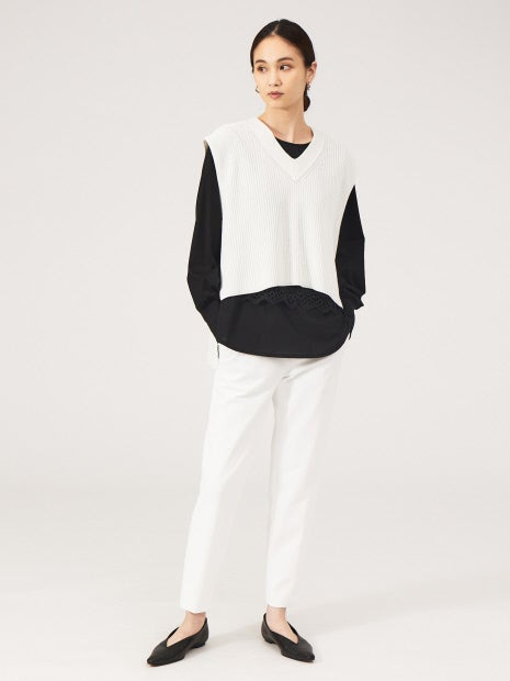 着膨れしない、すっきりしたシルエットのニットベストなので、どんなボトムとも好相性!