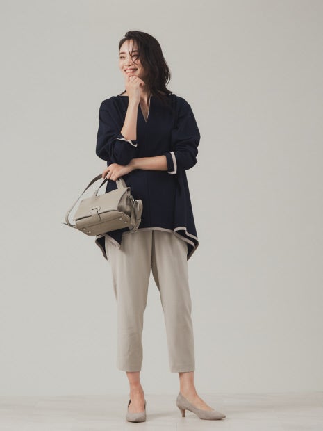 ・ハイウエストデザインで、ウエストの上端に配色のコードを施すことでウエスト位置が明確になりスタイルアップ効果の高いパンツ。