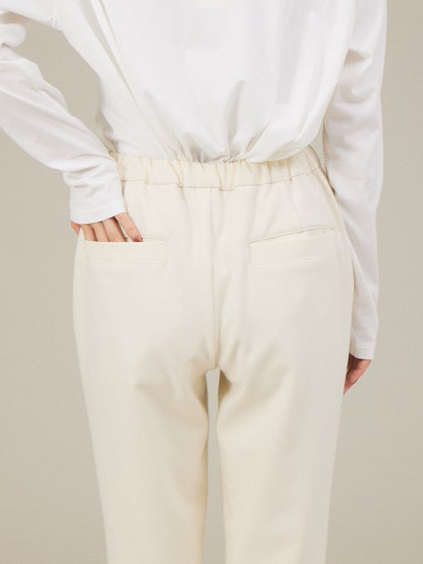 前はフラットでウエストは後ろゴム仕様になっており、すっきり見えを叶えつつ、ストレッチ感もあるので穿き心地抜群。