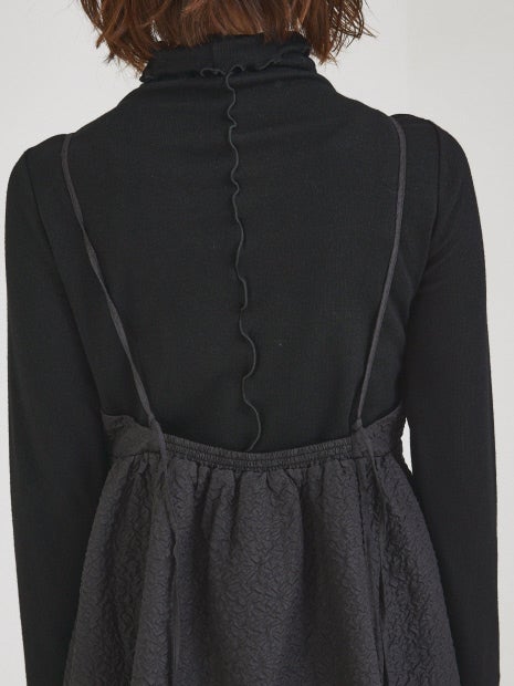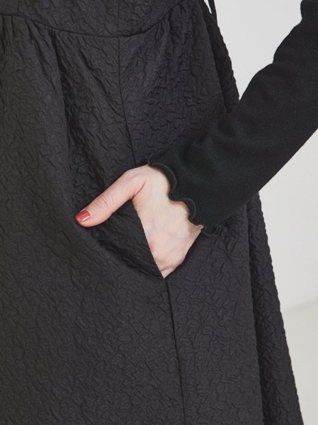 ポコポコと表面感のあるエンボス加工のキャミワンピ。フレアーシルエットでフェミニンに。あえて肩紐は長めに設定。胸の位置を低いバランスで着用することによって可愛らしくなりすぎないシルエットに。肩紐は長さ調整可能です。