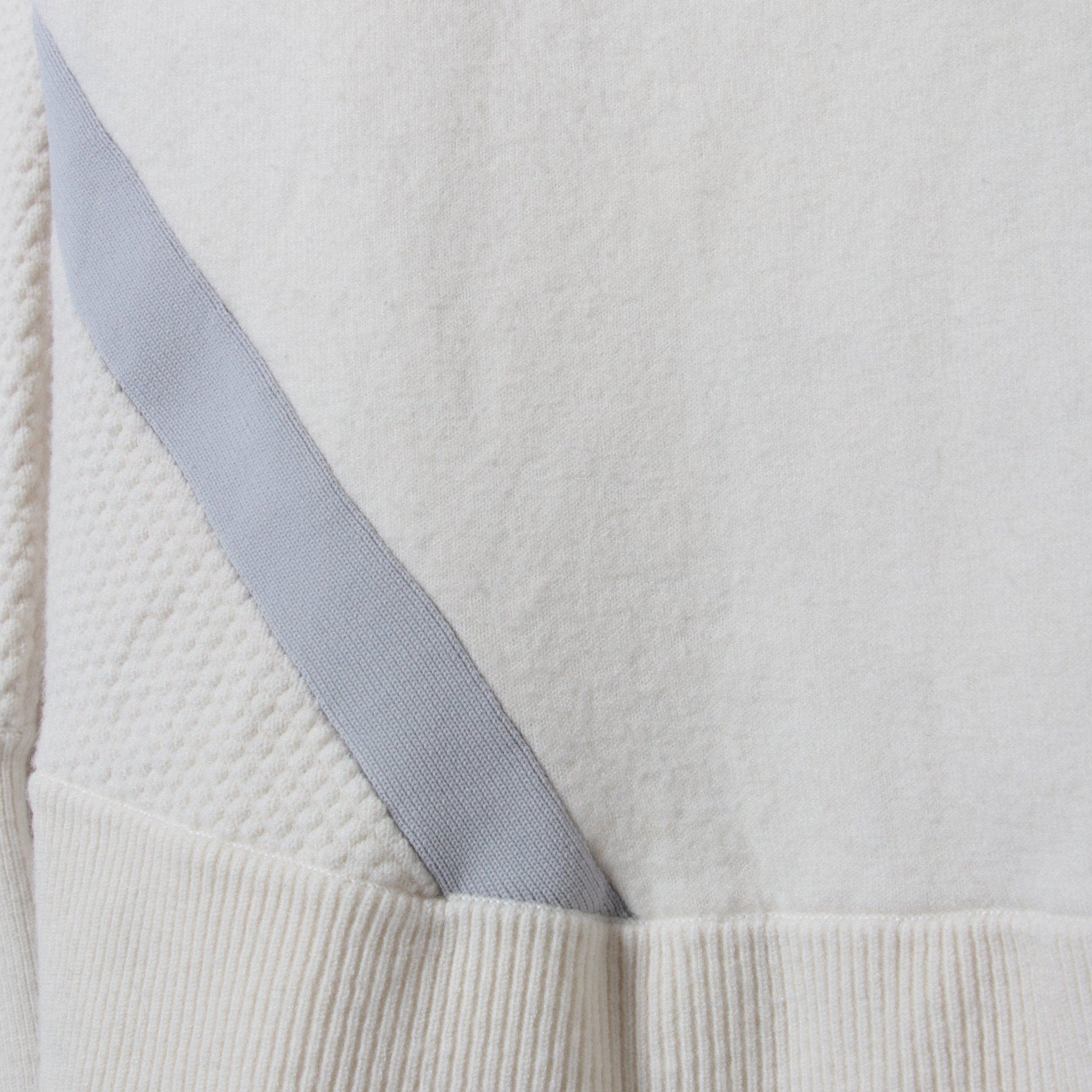 ウール特有の保温性、バルキー(嵩高)性に加え、ストレッチ糸のキックバック(反発)性と耐久性を兼ね備えたハイブリッド素材を採用。吸水速乾性、放湿性に富み、肌触りや着心地も抜群です。また保形性が高く、伸びやすい袖口などの部分も型くずれしにくいのが特徴になっています。