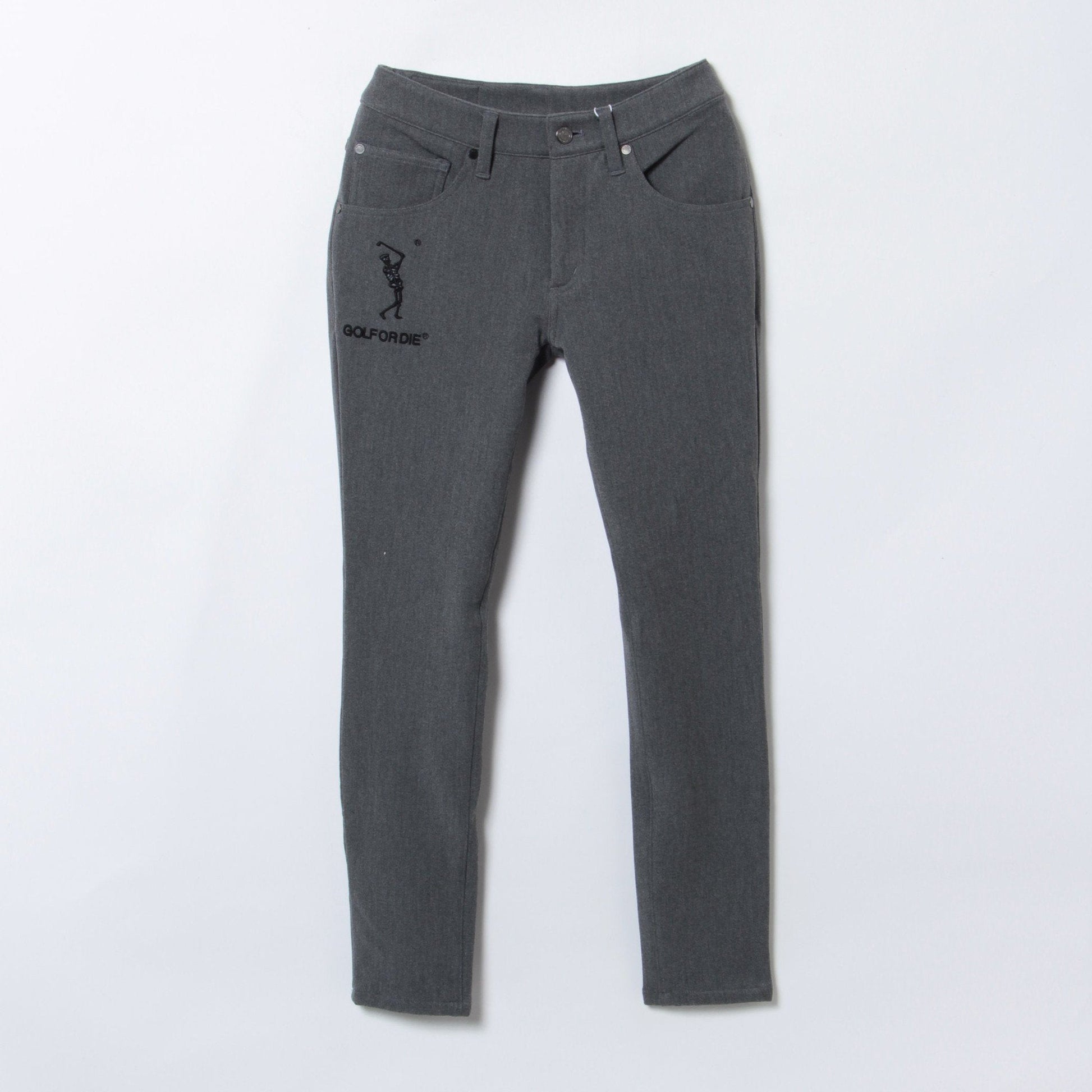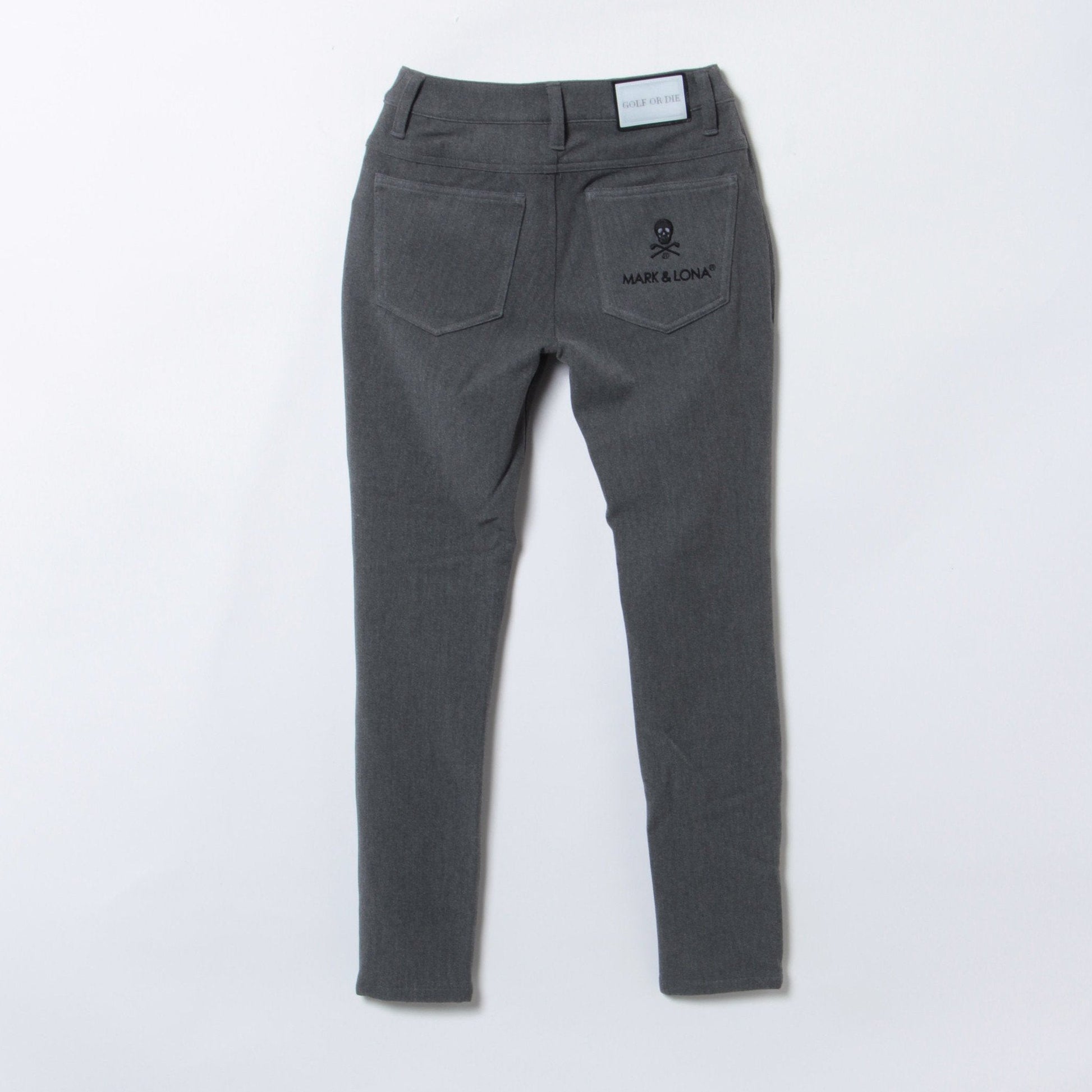 カシミヤタッチ仕上げのフリース素材を採用した、フルレングススキニーパンツ。フロントにサークルスカルが刻印されたネオバーボタン、フロント右ポケットにスカルスイング刺繍、右後ろパッチポケットにアイアンスカルとブランドロゴを刺繍で表現しました。ややローウエストで、素材特性である高いストレッチ性を活かしたスキニータイトフィットシルエットのパターンを採用。美脚見せ抜群のすっきりとしたデザインになっています。