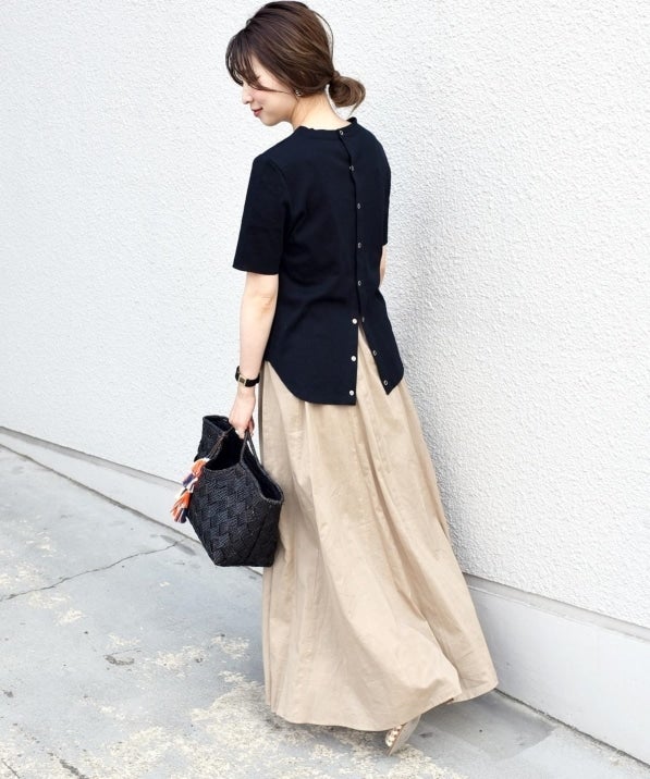 バックのボタンもポイントで、ボタンをあけてスリット風に着てもスッキリと綺麗なシルエットになってくれるデザイン。