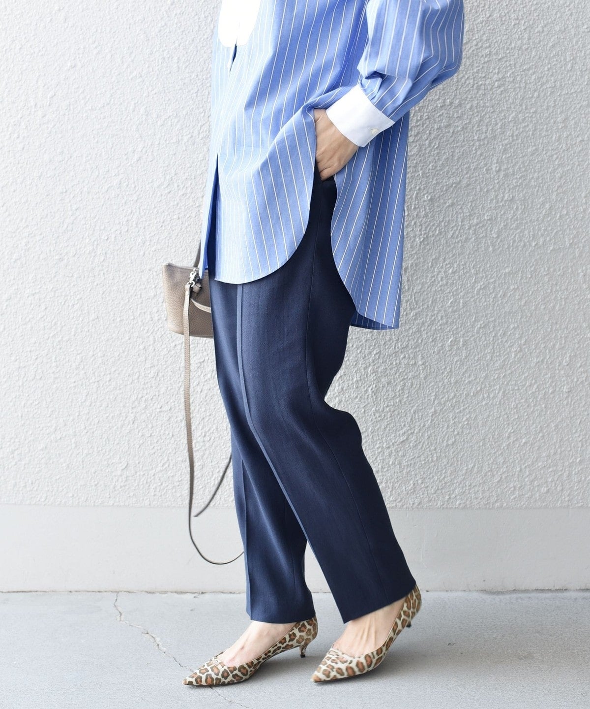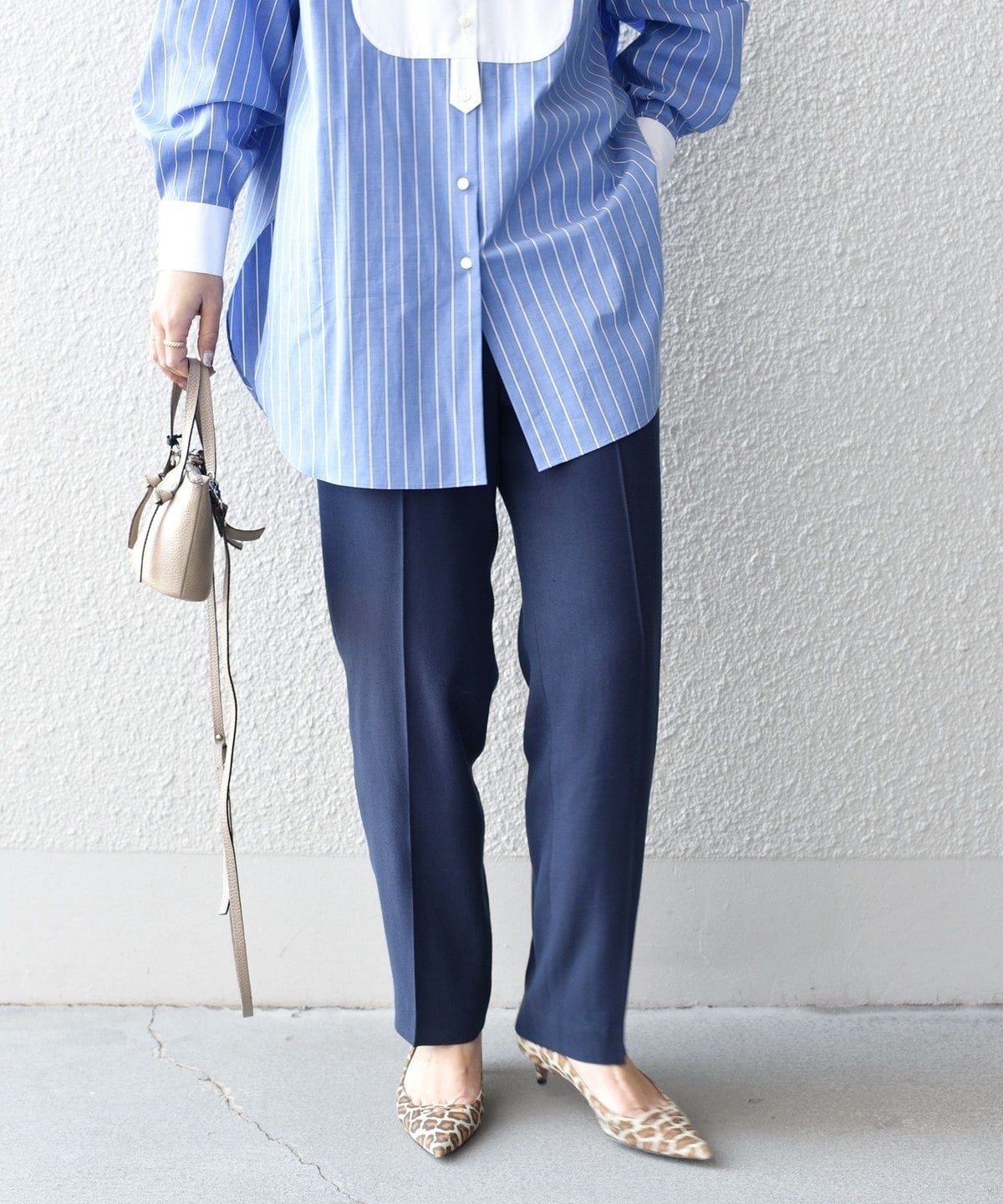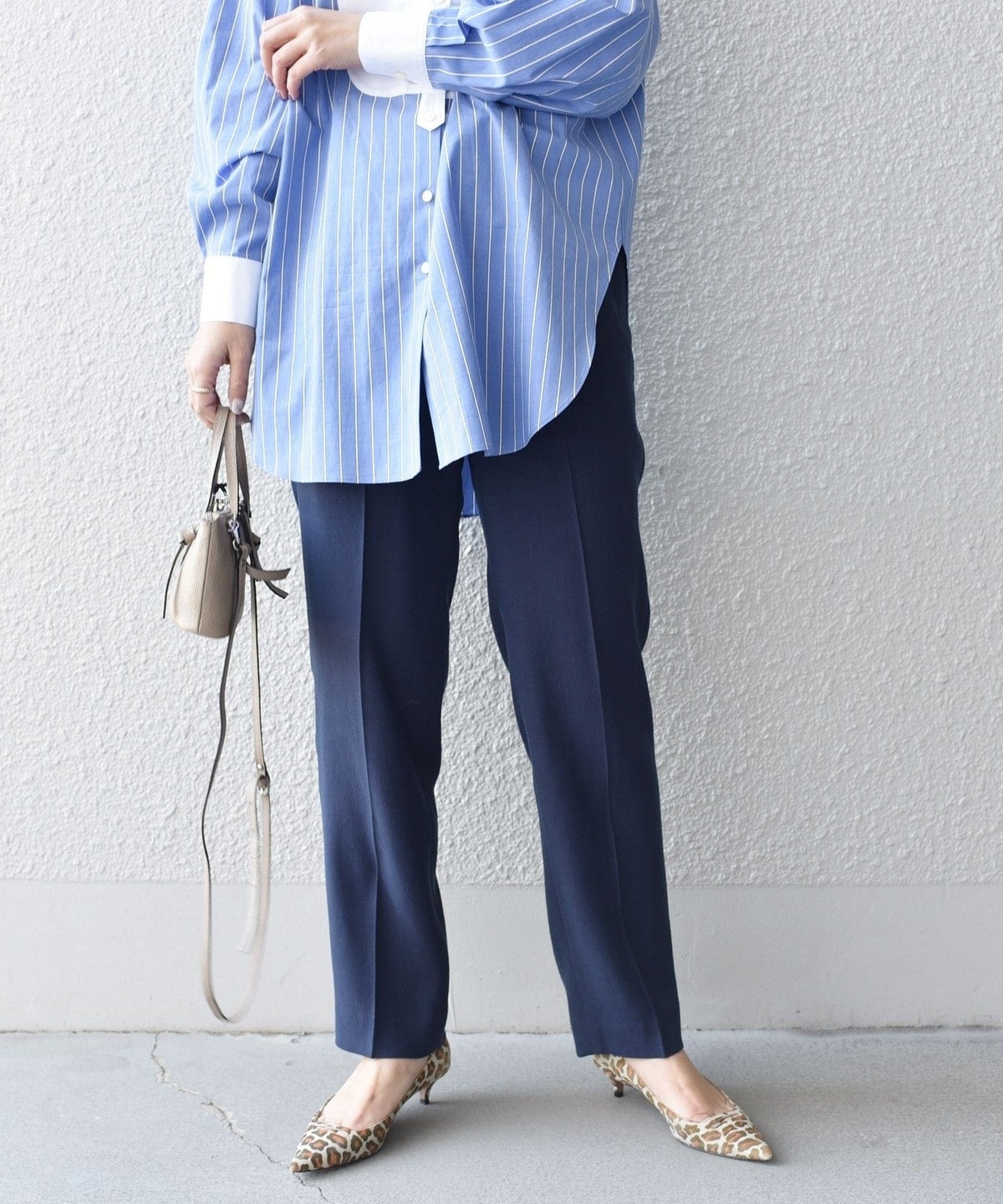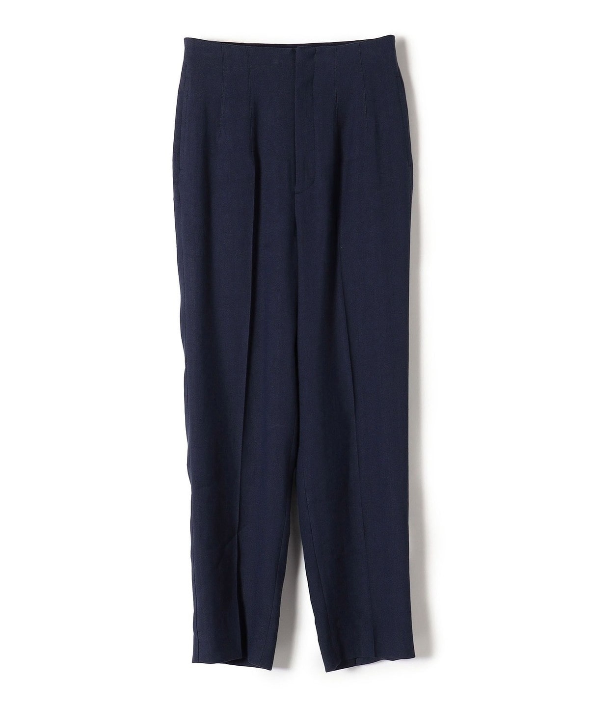 ナチュラルストレッチが効いた、やや細身のハイウエストパンツは単品としても着回せる便利アイテム。