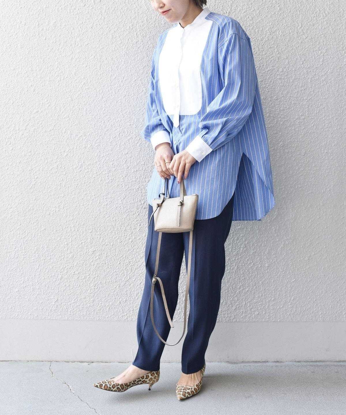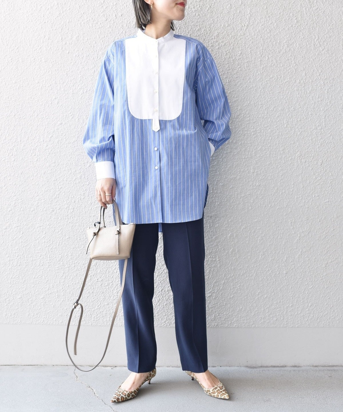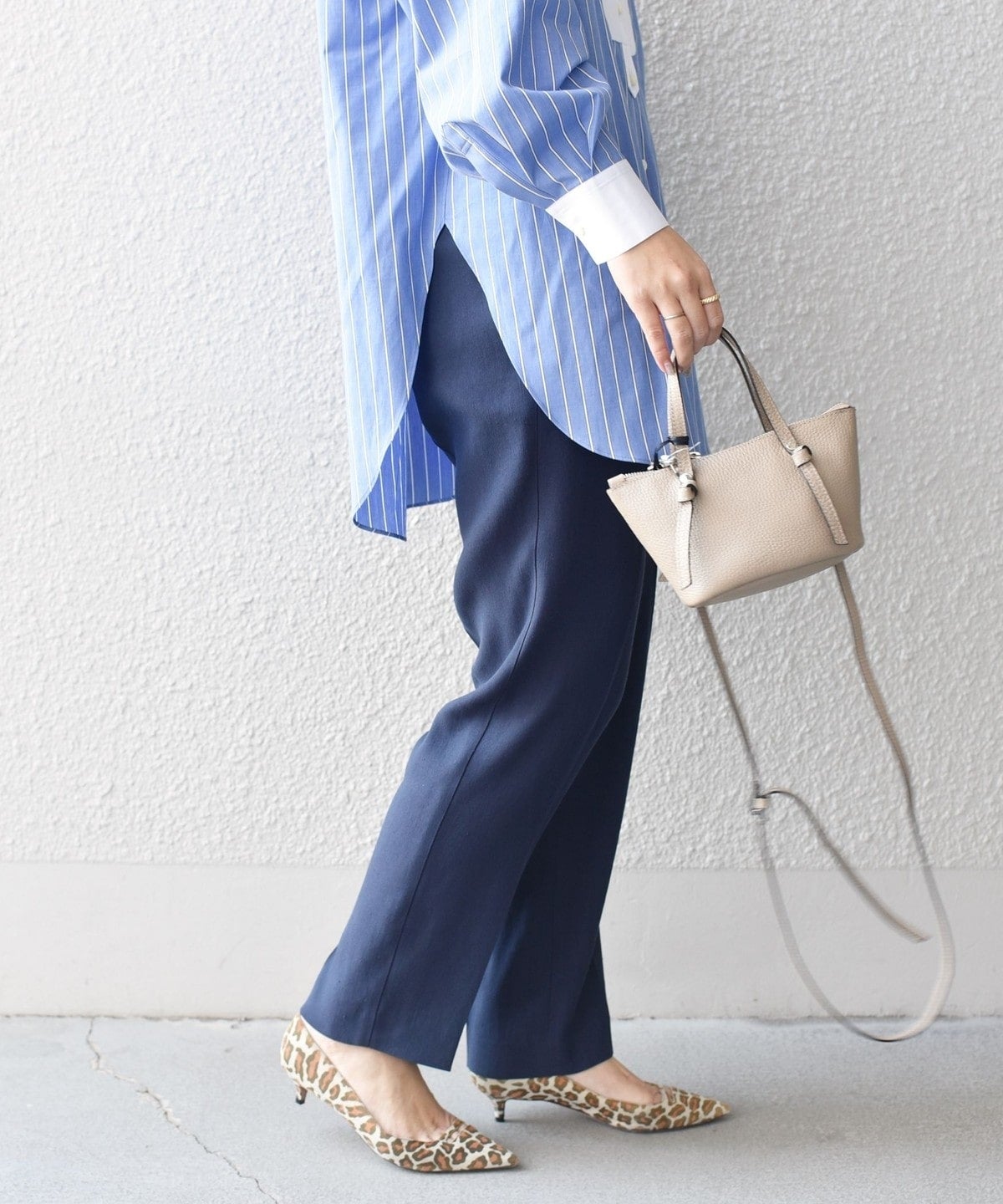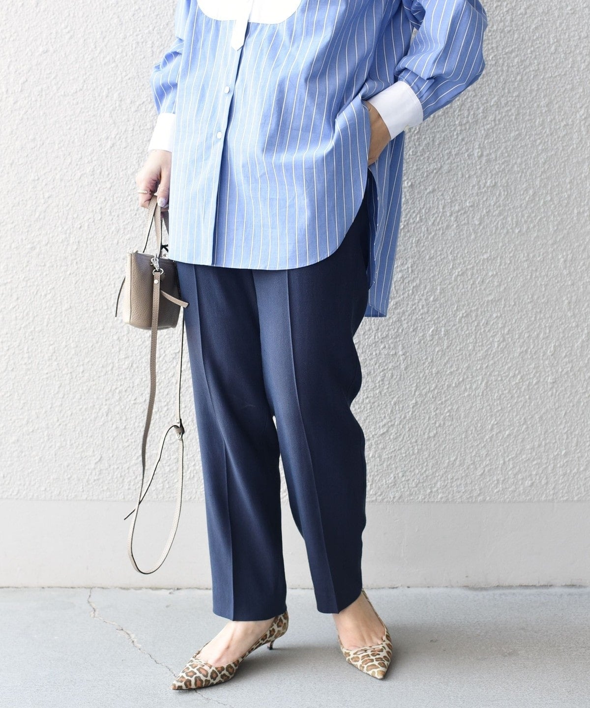 ナチュラルストレッチが効いた、やや細身のハイウエストパンツは単品としても着回せる便利アイテム。