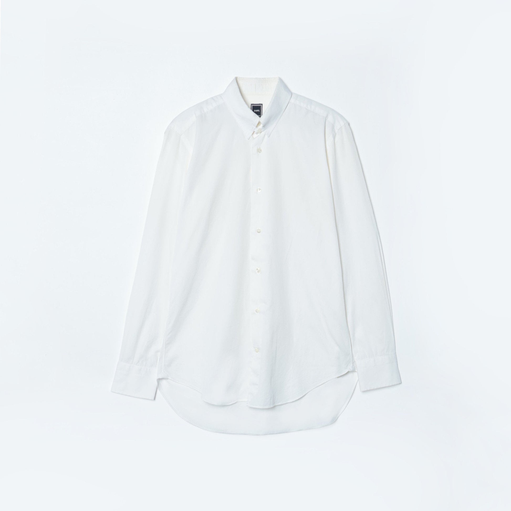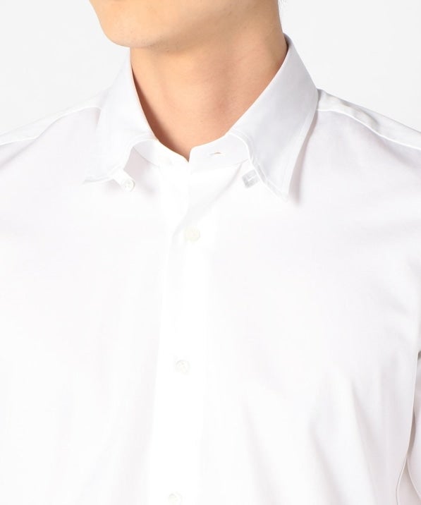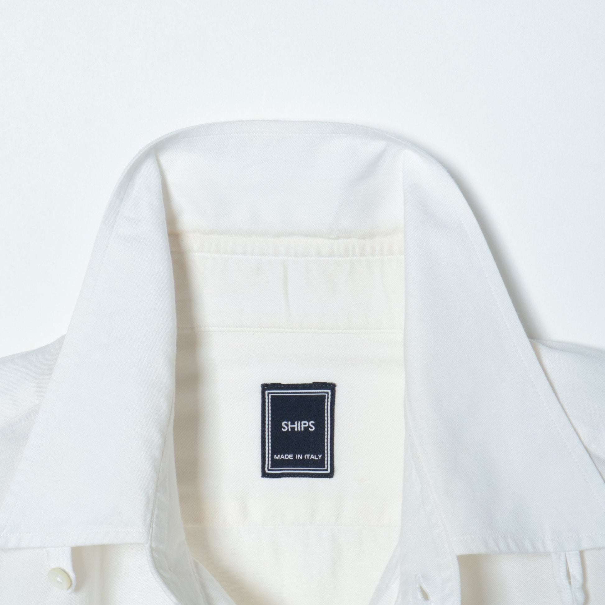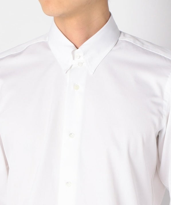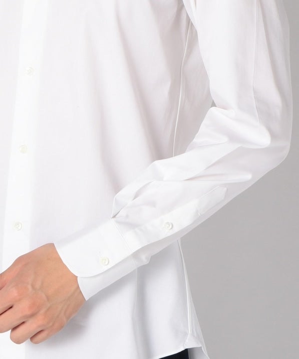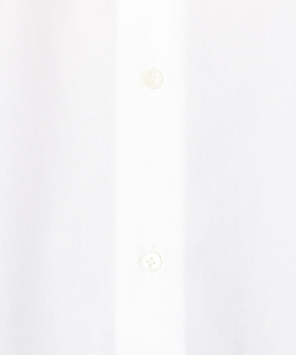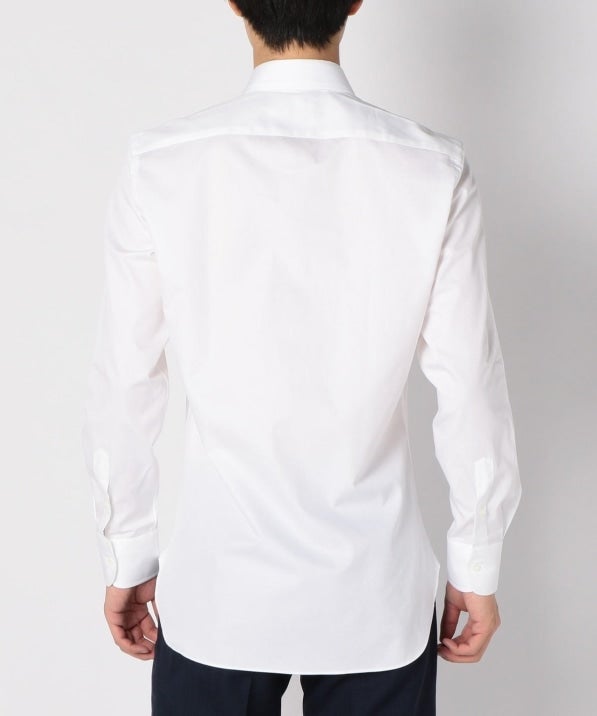 その中でこちらは南イタリアの某ファクトリーに依頼したビジネスシャツ。非常に洗練された表情があり、またステッチの細かさや、巻き縫い(サイドや裾、袖の内側の縫い目)も高級シャツの様に細く繊細に仕上げています。襟はタブカラーとなっており、クラシック回帰のトレンドに合った着こなしを体現できるアイテムです。