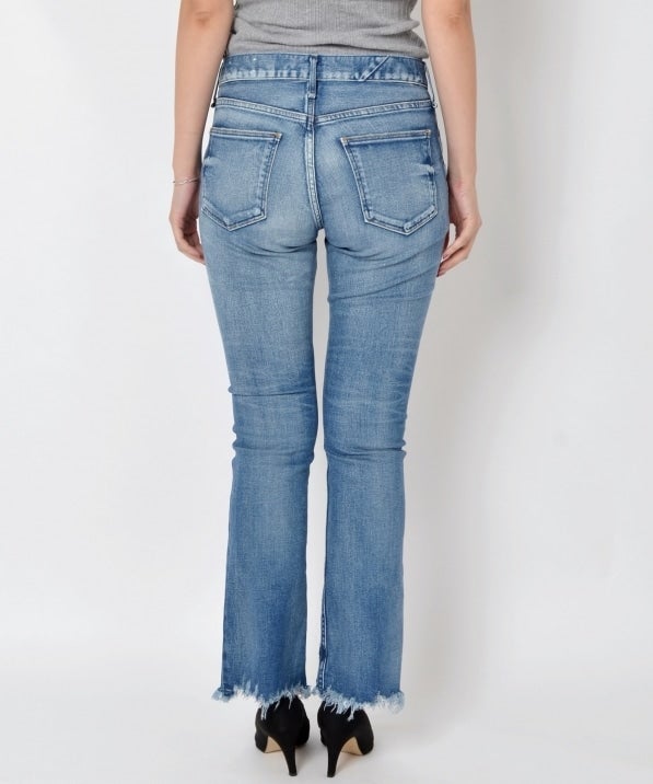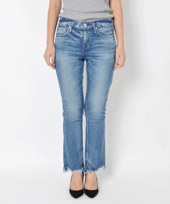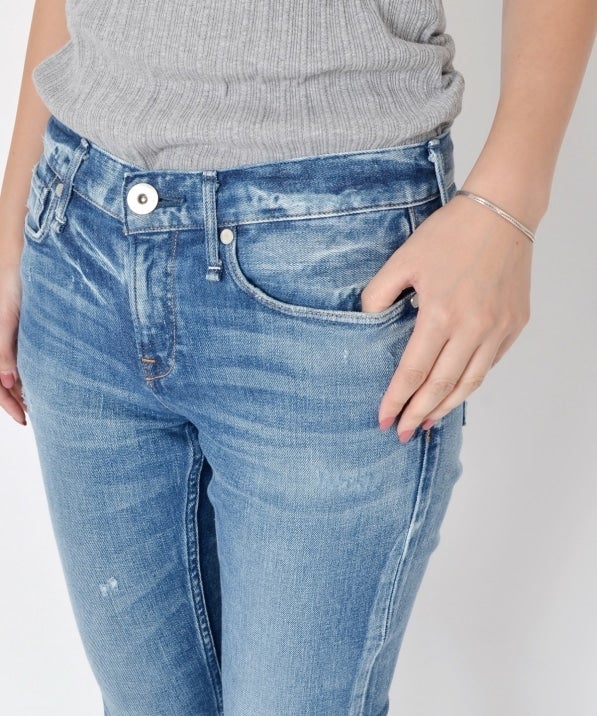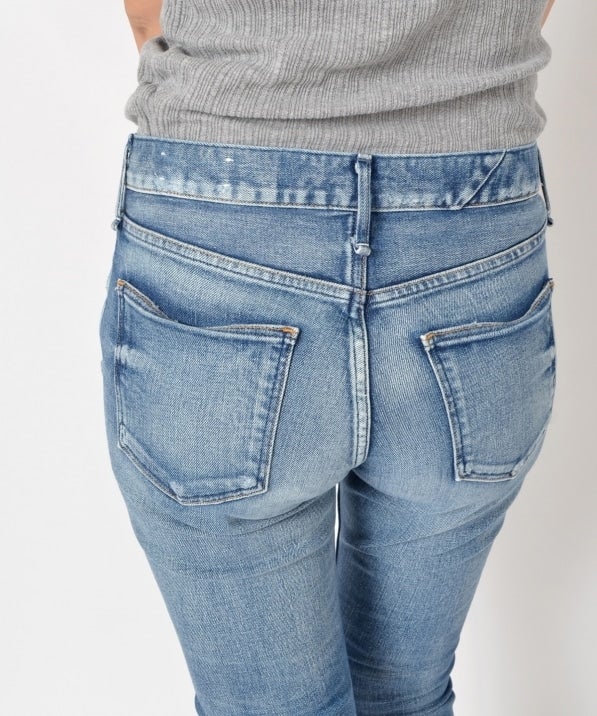 【upper hights】のTHE SHOES。細身のシルエットに裾が切りっぱなしになったデザイン。upper hightsのデニムは、ボタンなどのディテールが華奢で綺麗めに作られているので、大人カジュアルにぴったり。スニーカーでもヒールでも合わせられるデザインも魅力です。