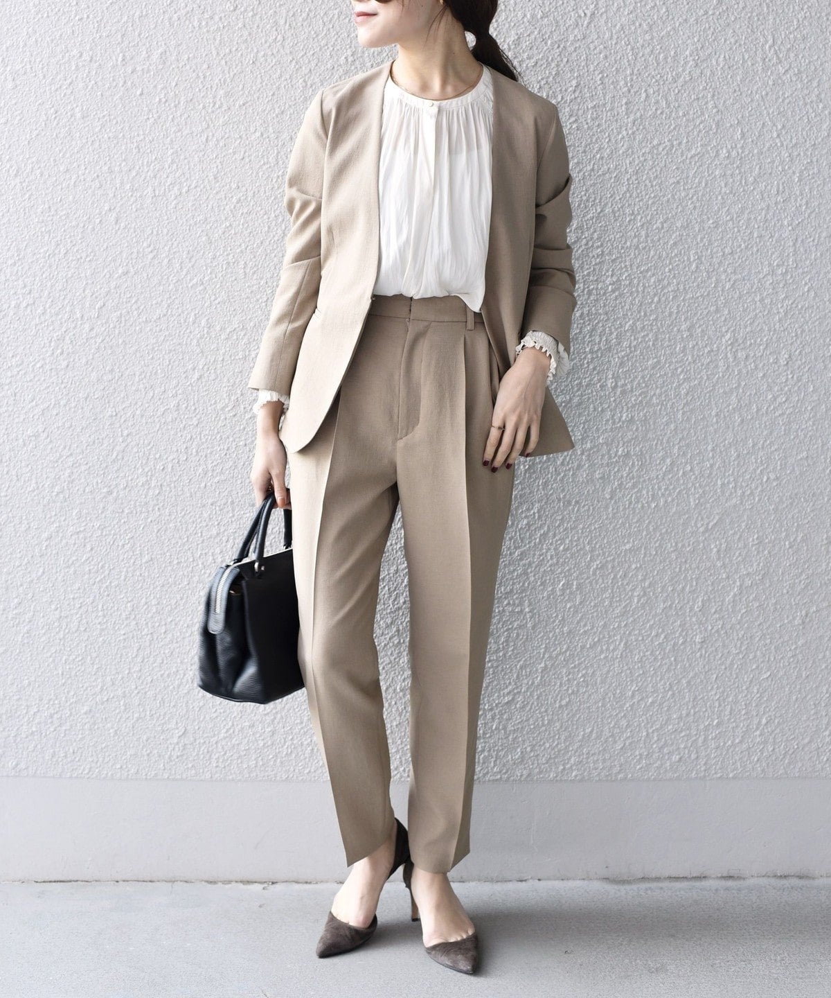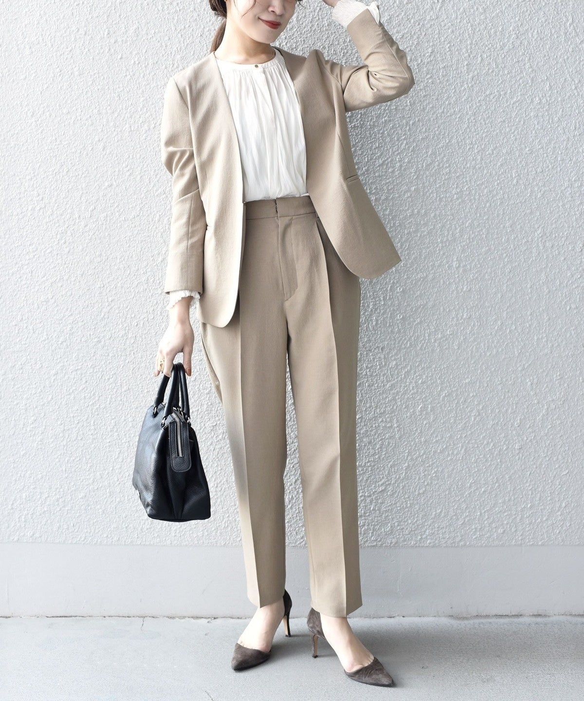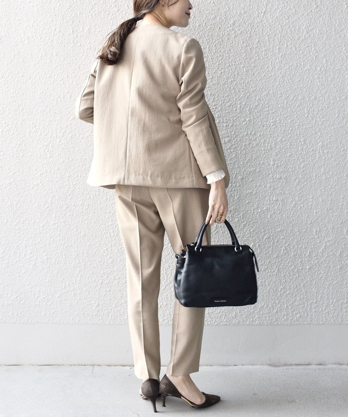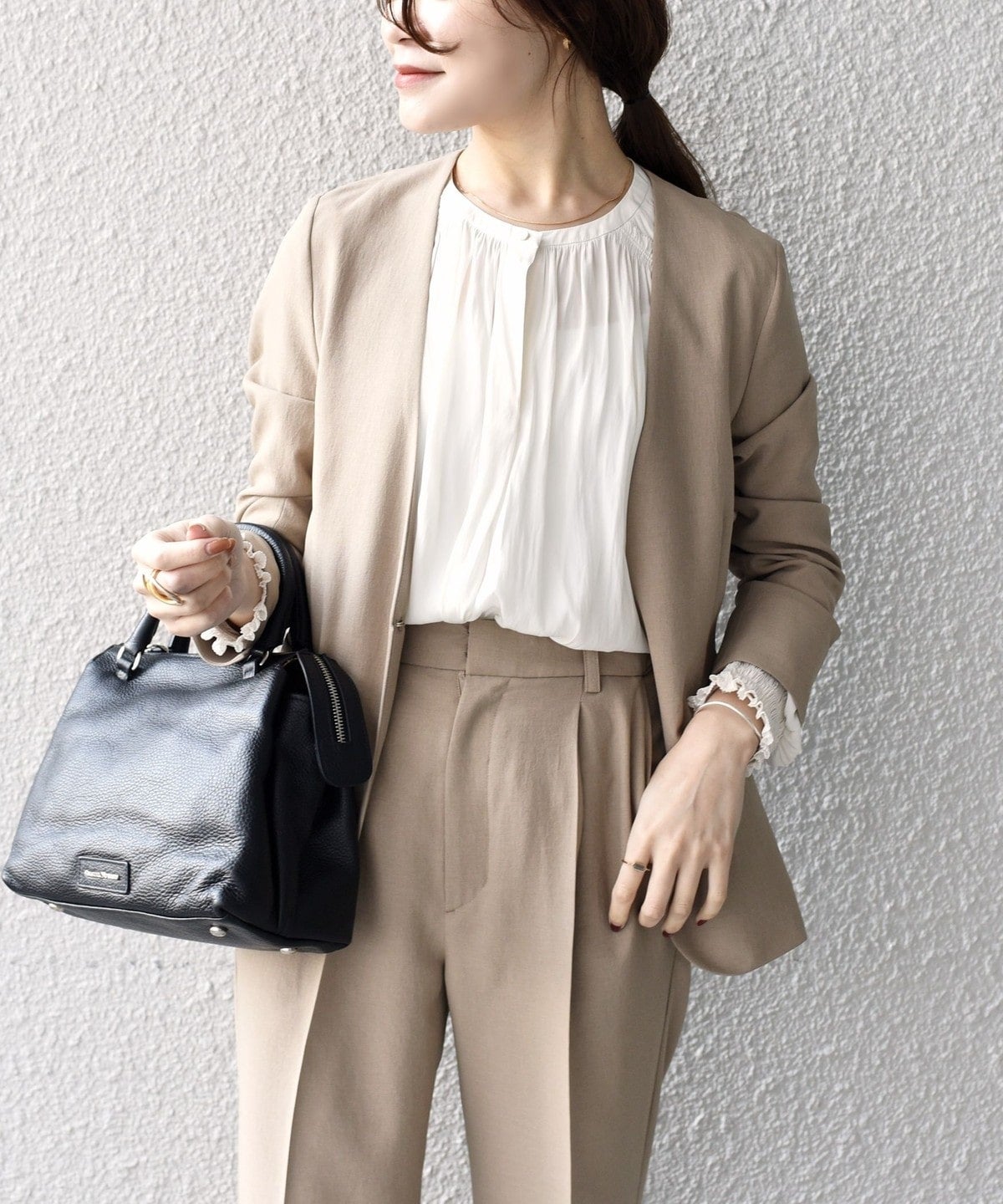 カーディガン感覚でさらっと軽く羽織れるので、セットアップとしてはもちろん、単品でも着回ししやすいジャケットです。