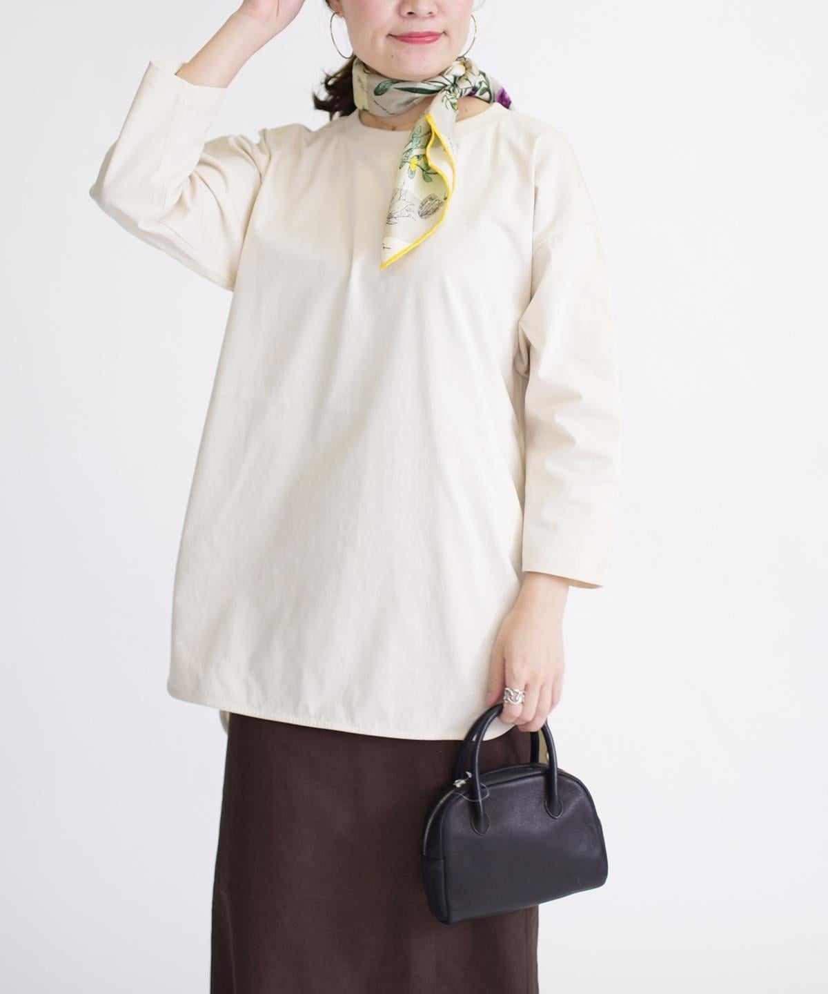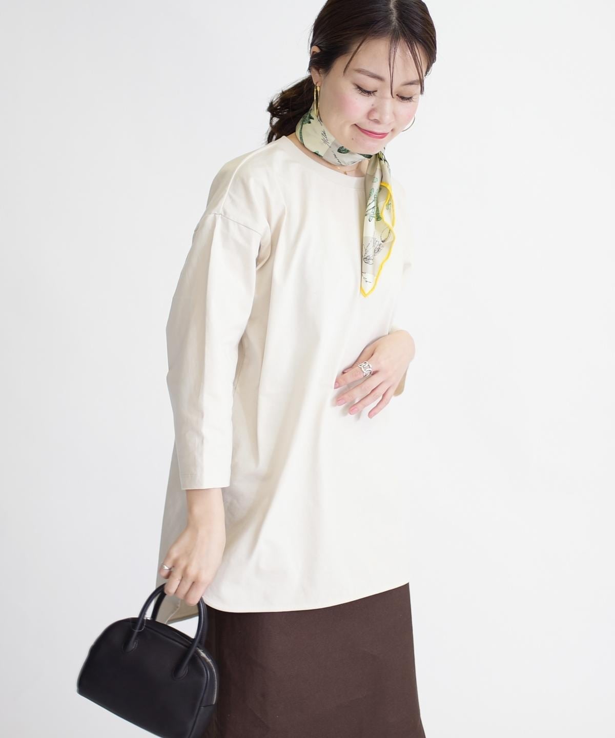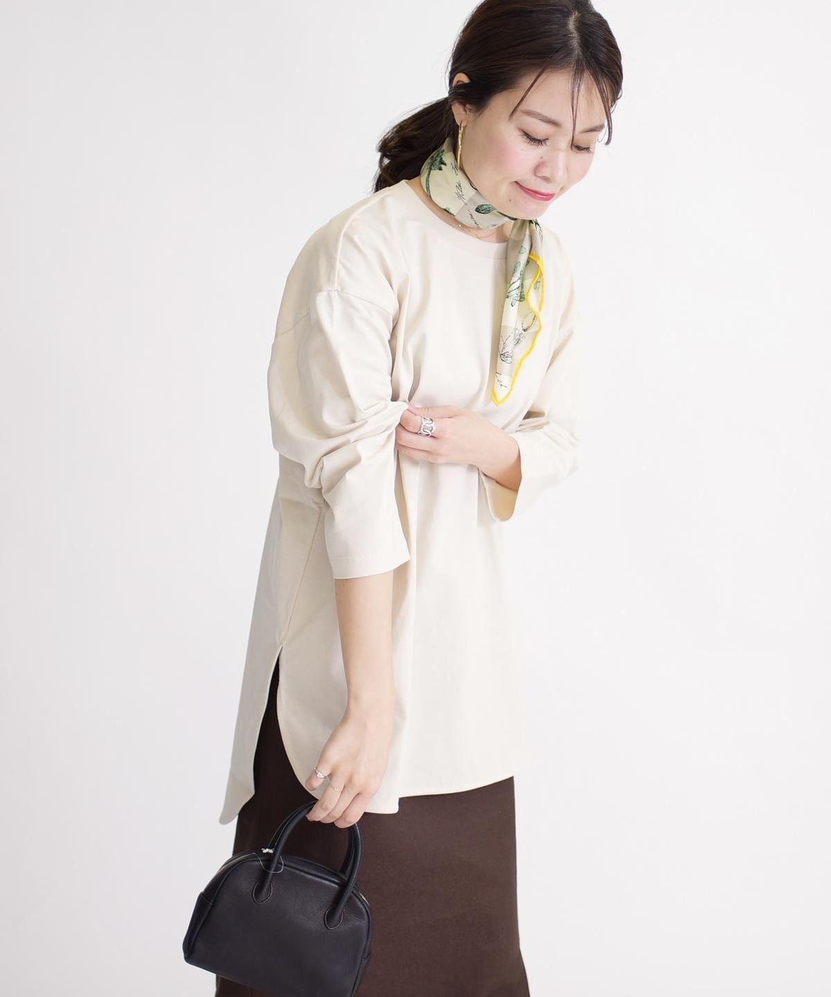 上下差があるのでヒップ周りをカバーできるのも嬉しいポイントです。8部丈の袖なのでシーズン長くご愛用頂けます。