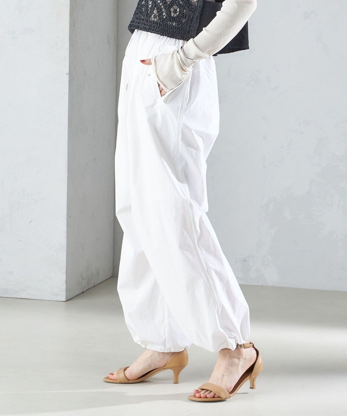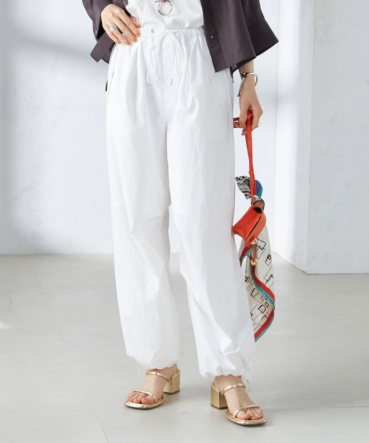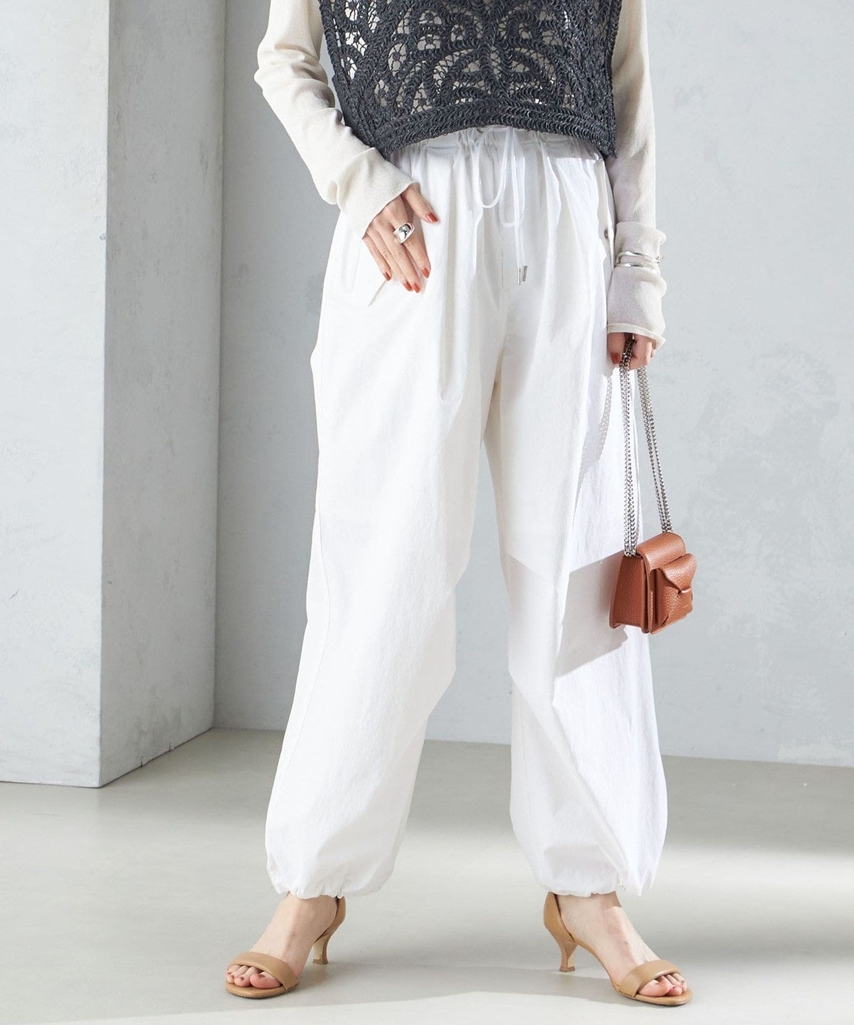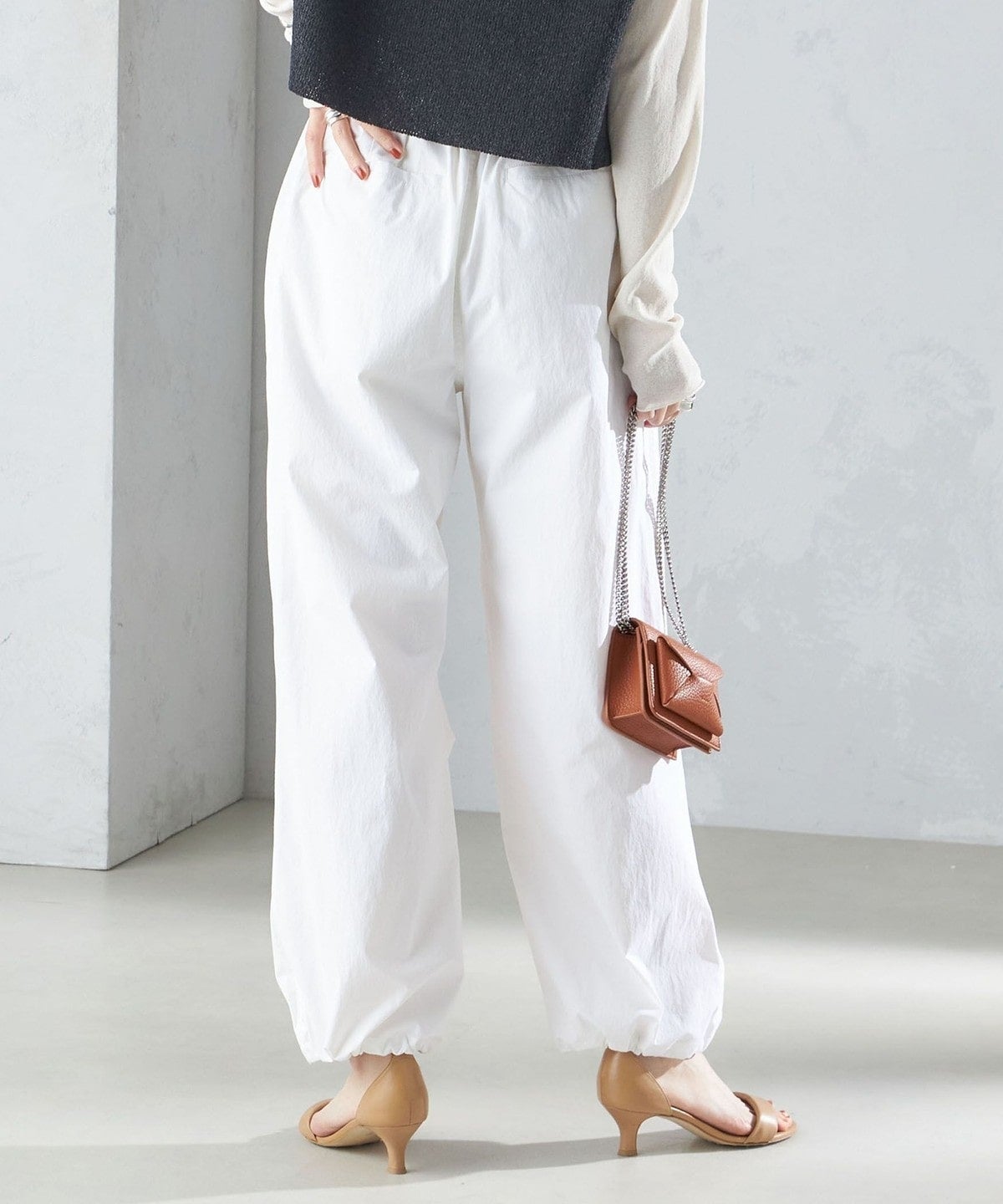 タックで立体感を持たせた膝まわりのデザインや、裾口にコードを施し気分に合わせてシルエットに変化を加えられるのもポイント。