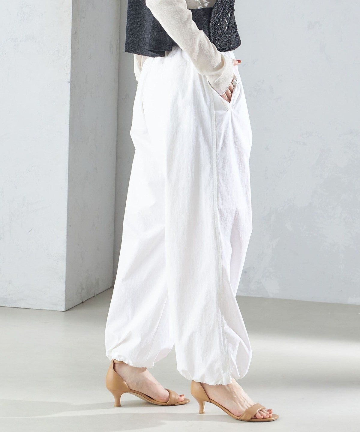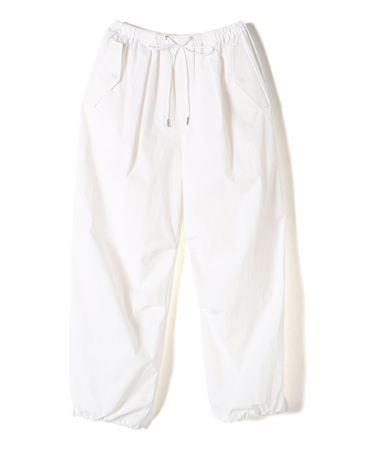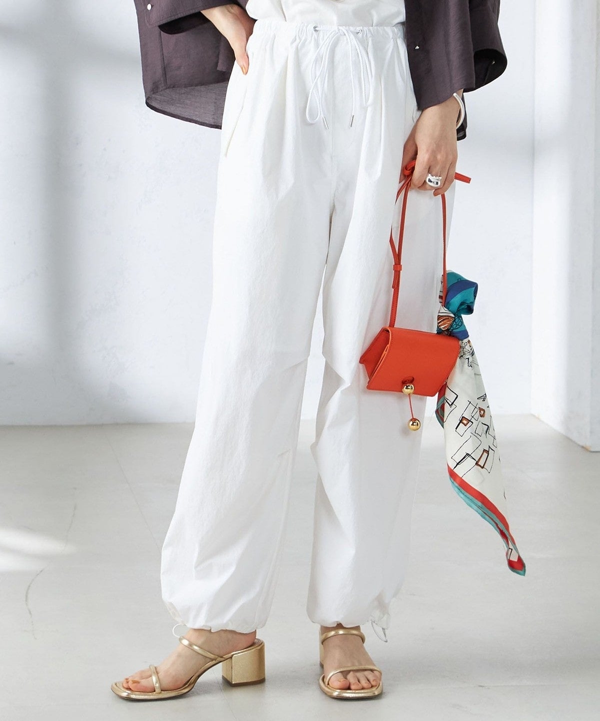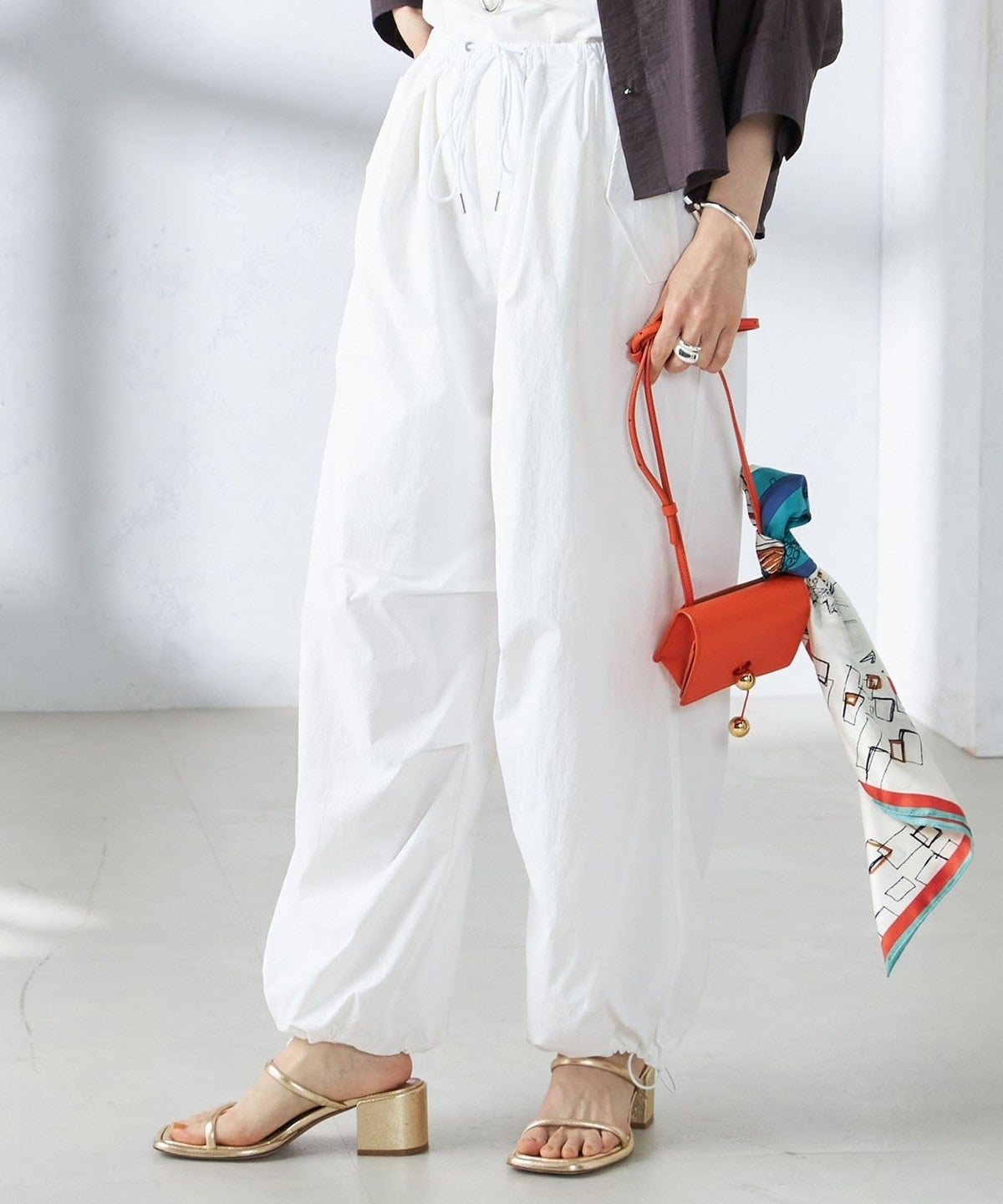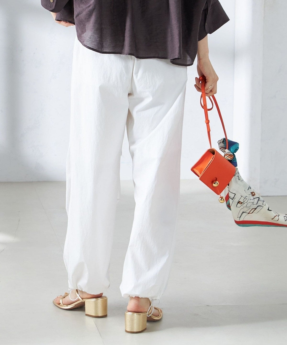 タックで立体感を持たせた膝まわりのデザインや、裾口にコードを施し気分に合わせてシルエットに変化を加えられるのもポイント。