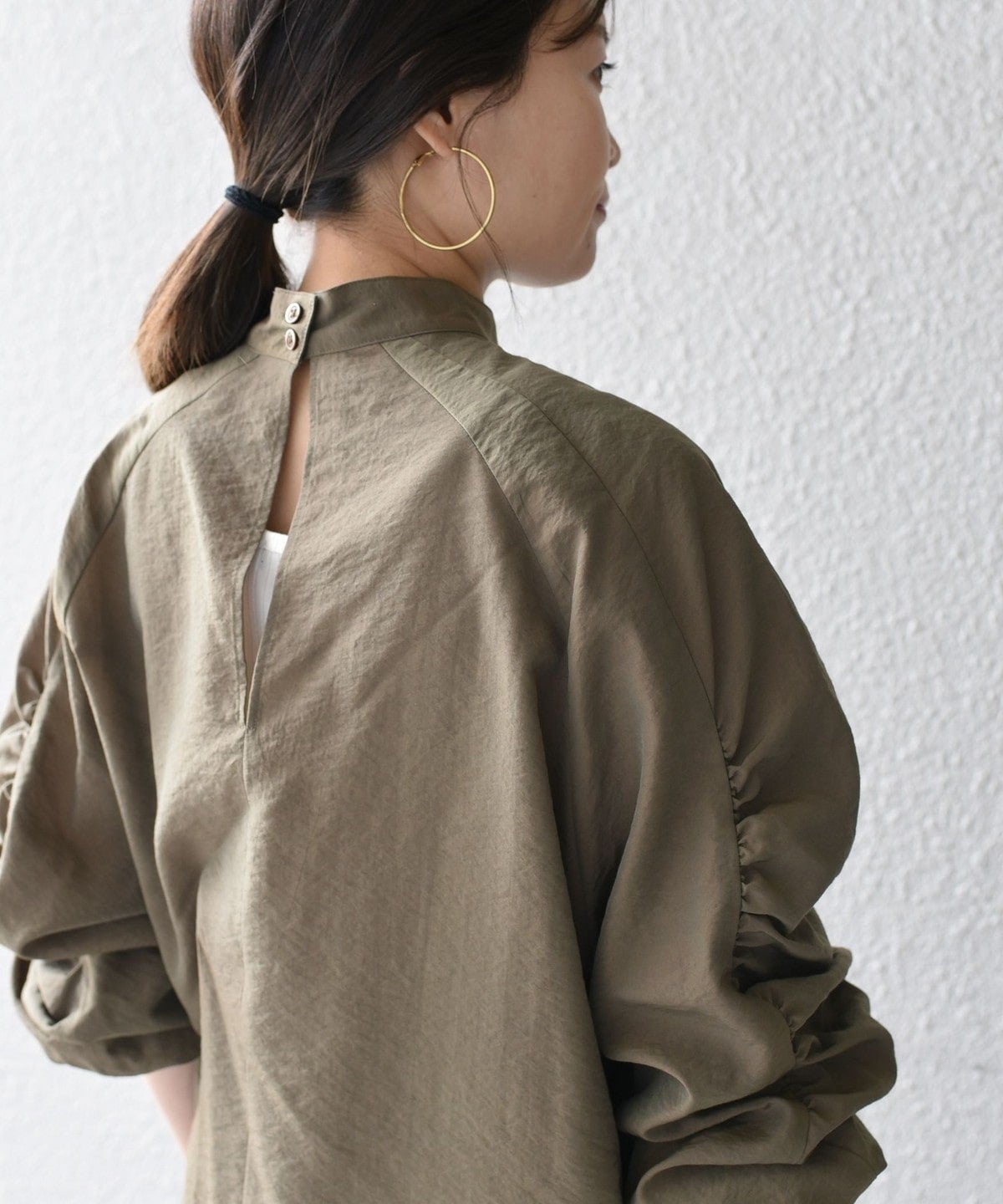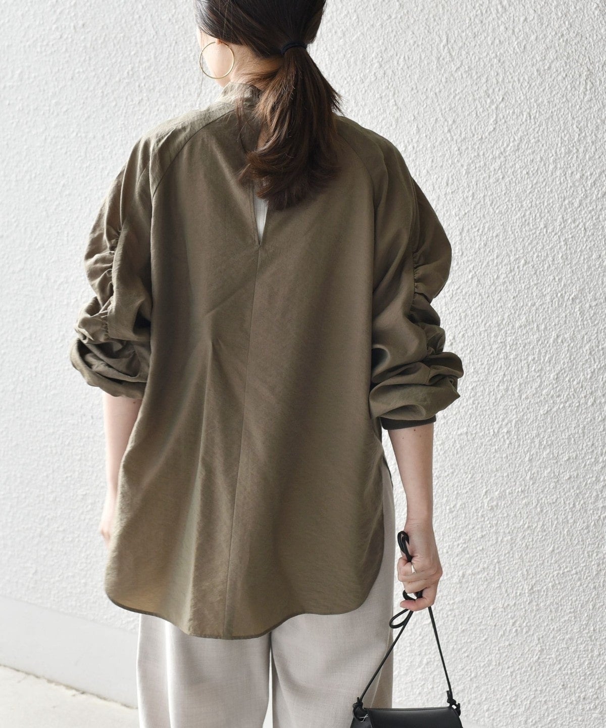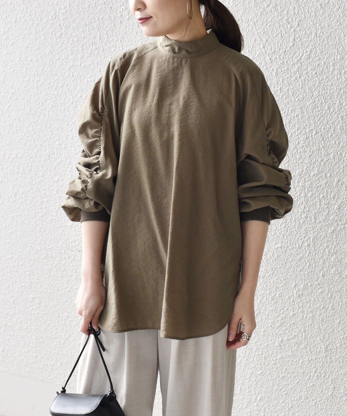 前回ご好評頂いたギャザートップスをブラウスにアップデート。カジュアル見えしていたトップスが一変、ドレスアップにまで活用できるアイテムに。
