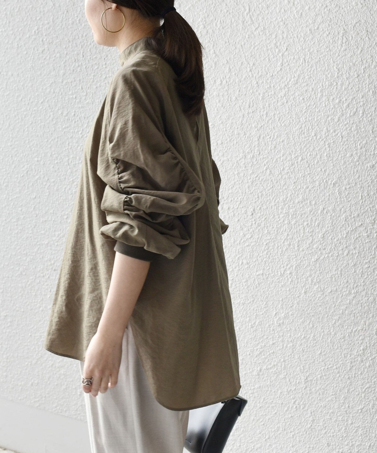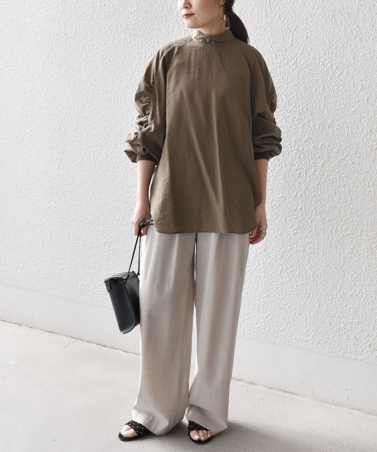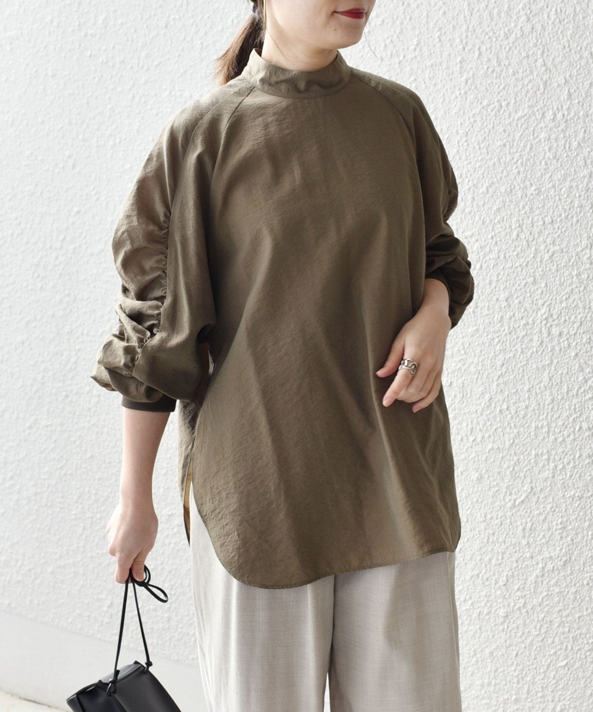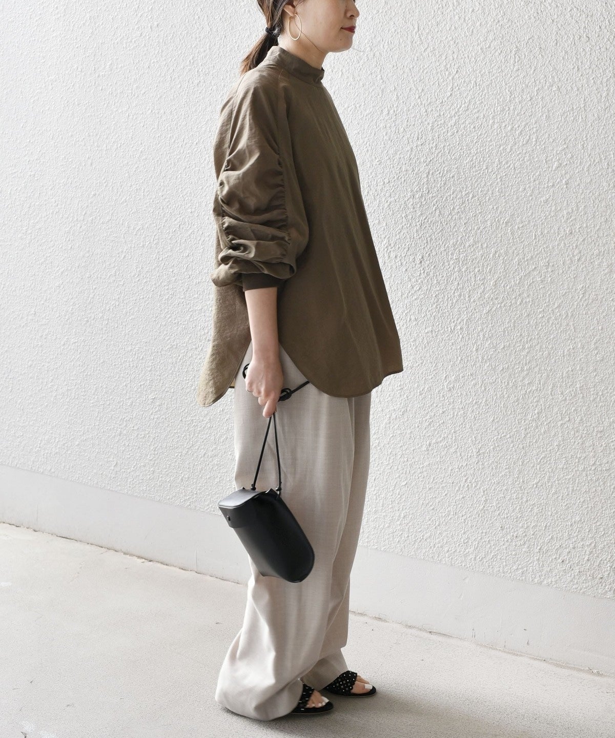 前回ご好評頂いたギャザートップスをブラウスにアップデート。カジュアル見えしていたトップスが一変、ドレスアップにまで活用できるアイテムに。