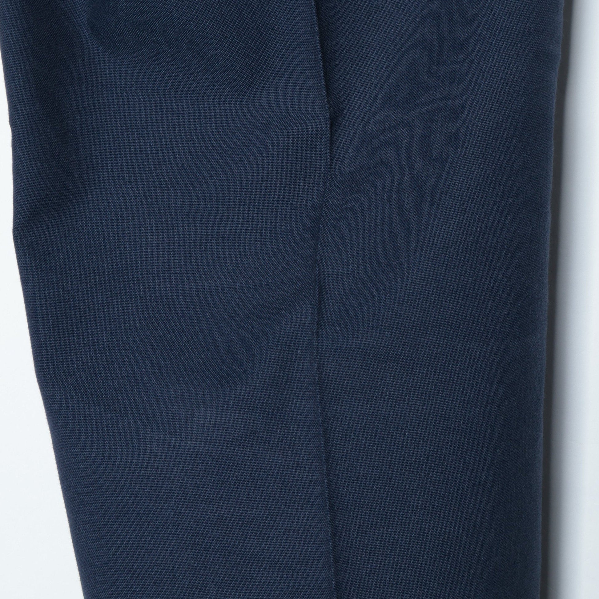 経糸にアメリカンコットンの綿40/2、緯糸にT400(伸縮性ファブリックの多様なニーズに対応するために開発された、ポリエステル系複合繊維)を使用し、こだわりの先染めで仕上げたノープリーツパンツ。