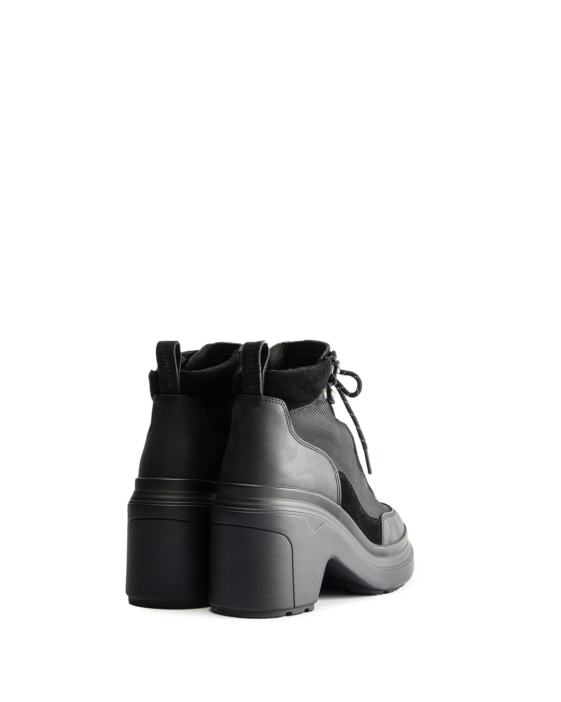 ハンターの新しいハイヒールシルエット、エクスプローラーアンクルレースアップヒールブーツは、アッパーに耐水性のリサイクルポリエステルとレザーを使用。ポリウレタン製のミッドソールにより軽量化を実現し、ソールは耐久性ラバーアウトソールを使用、パッド入りの履き口で快適な履き心地を提供します。耐水性確保のために内側にハイドロガードを使用した雨に強い防水加工を施し、ポリウレタン製のフォクシングで保護性能をさらに高め、一日中履ける一足です。ヒールにはFSC®認証の天然ゴムを使用し、裏地には100%リサイクルポリエステルメッシュを使用しています。