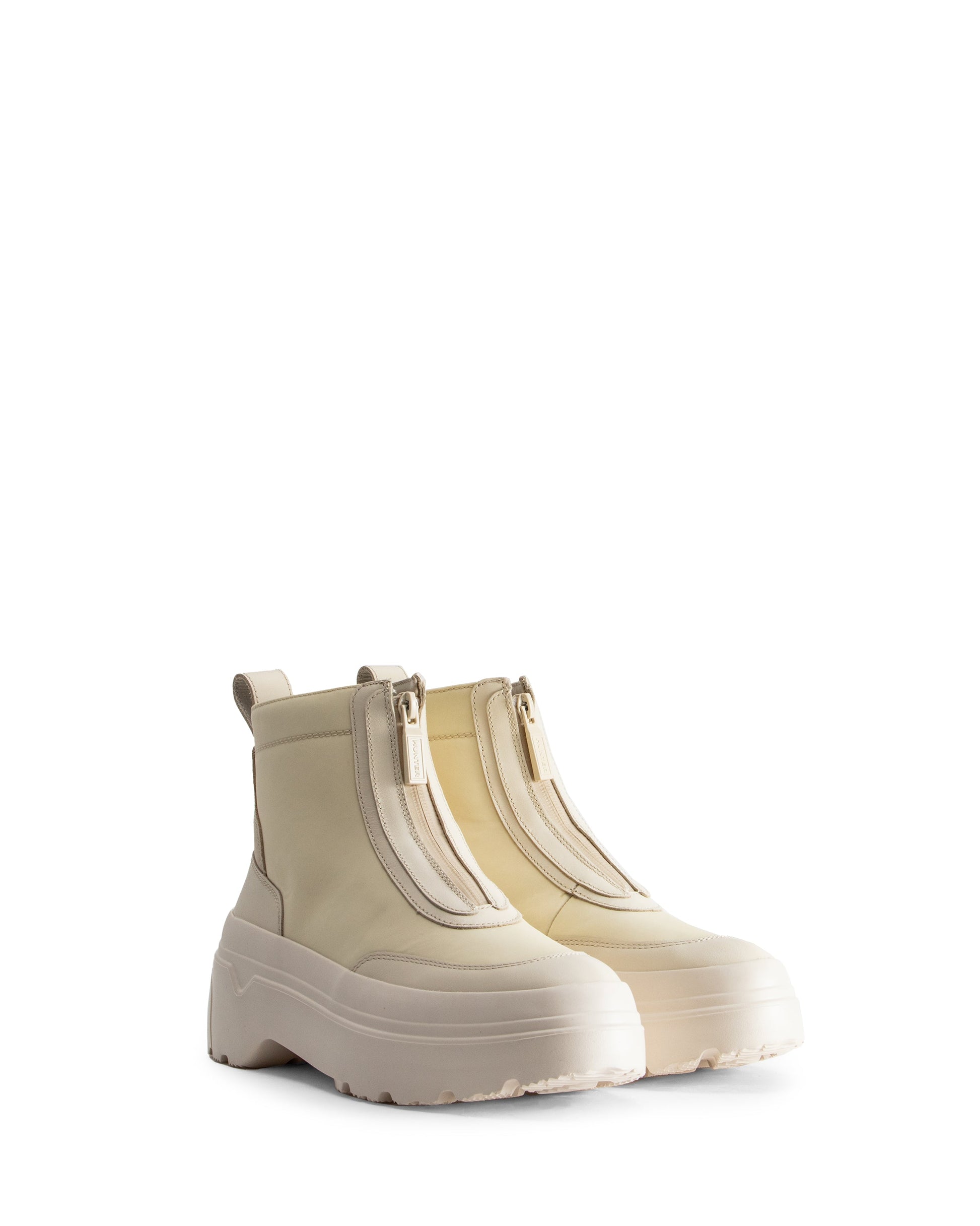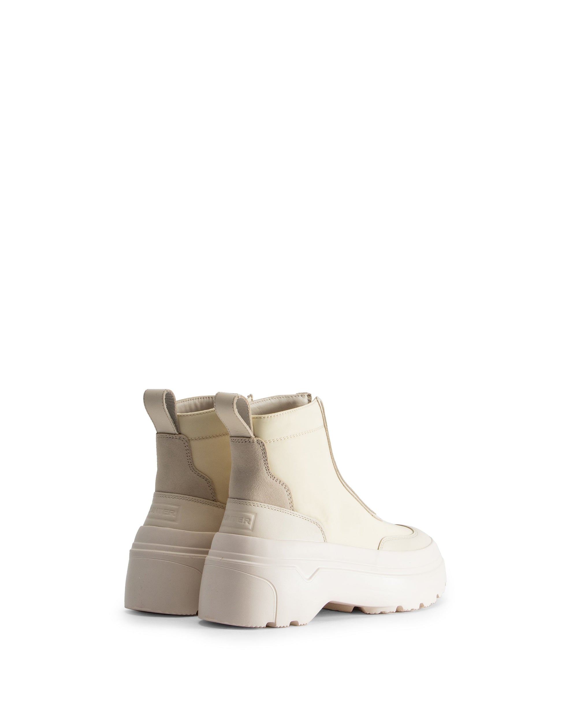 ハンターの1年を通して履ける新しいシルエット、エクスプローラーアンクルZIPフラットフォームブーツは、アッパーに耐水性のリサイクルナイロンとレザーを使用しています。リサイクルEVAを使用したアウトソール部分により超軽量化を実現し、止水加工ジッパーと内側にハイドロガードを使用した防水加工、テーピングにより高い防水性を確保しています。着脱が簡単で、ヒールにエンボス加工の同色ロゴ入り。