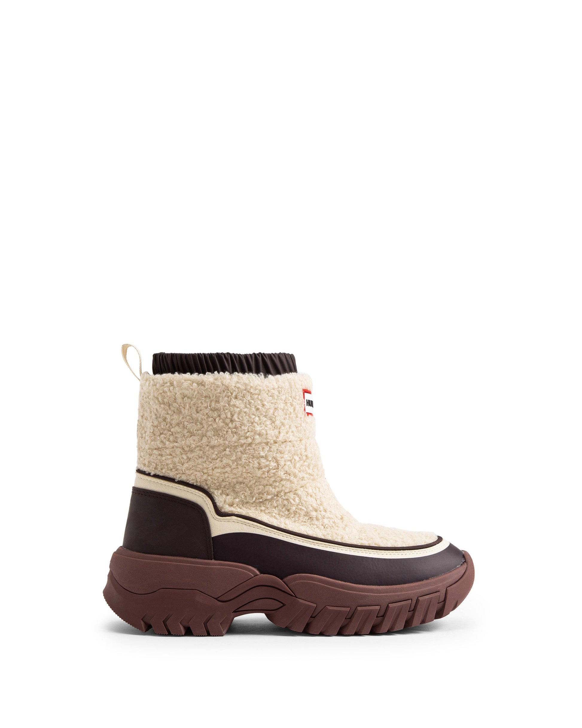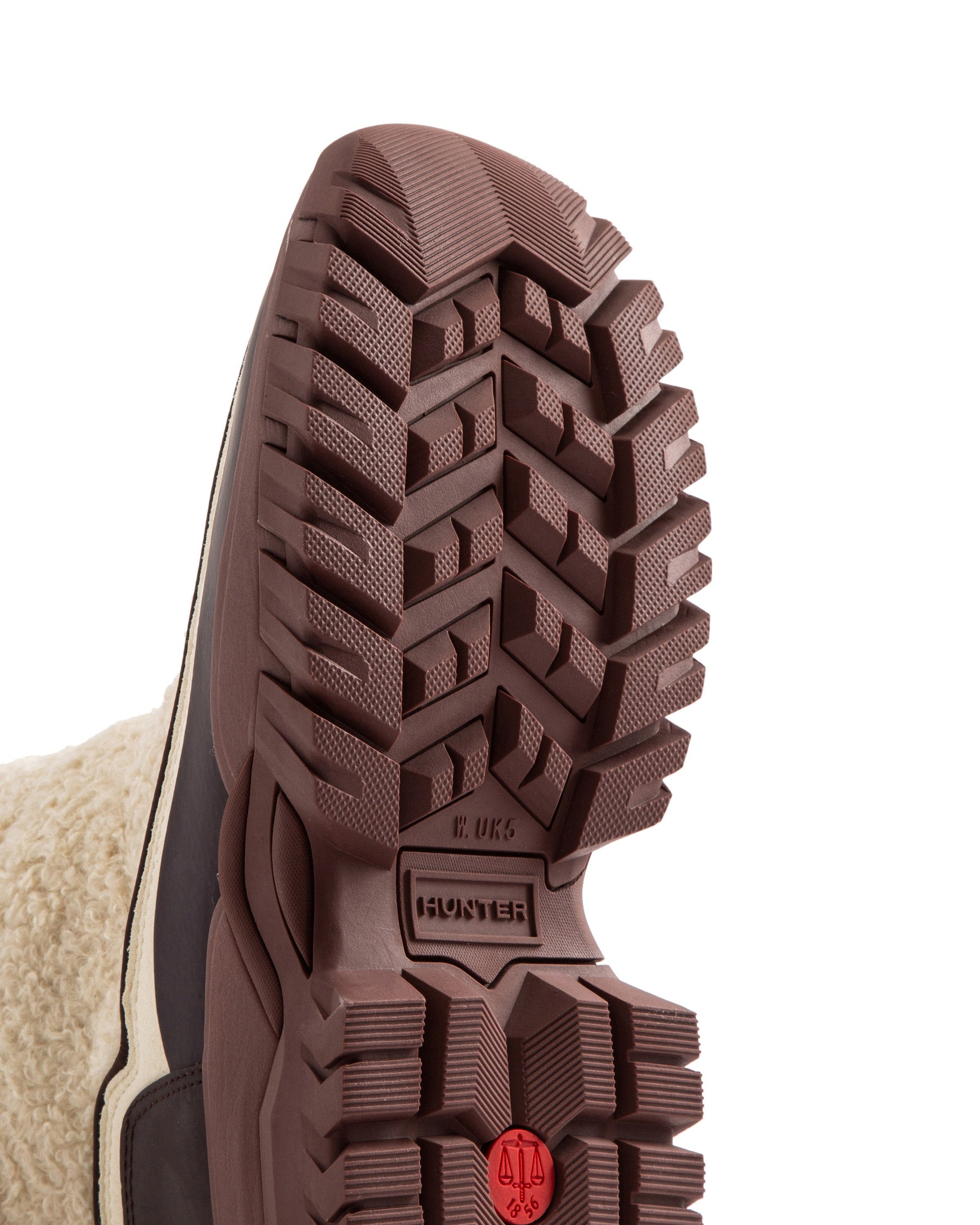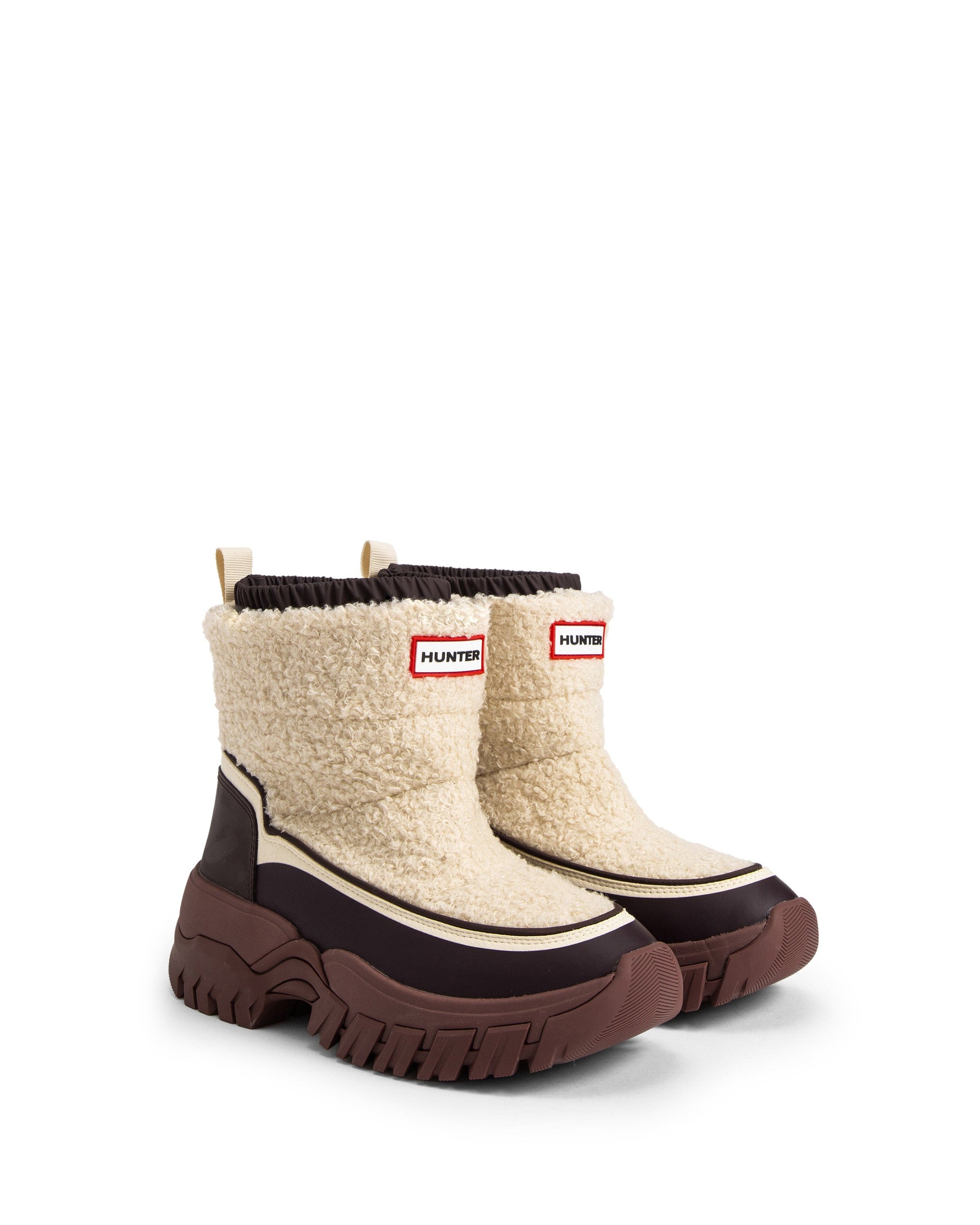 ワンダラーブークレショートスノーブーツは、スタイリッシュなシルエットでありながら、寒い冬を快適に過ごす為の、高い撥水機能と保温性を備えた高機能スノーブーツです。アッパー部分には耐水性メンブレンを使用し、少しの雨や雪の日も安心して、履いていただけます。(防水ではございません。)また、100%リサイクルフリースの裏地が高い保温性を発揮し、-30℃の環境まで対応しています。OrthoLite®の中敷きと、クッション性の高いEVAミッドソールを採用し、軽く快適な履き心地を提供します。フロント部分にはハンターのレッドボックスロゴがあしらわれ、背面には着脱に便利なプルタブ付いています。